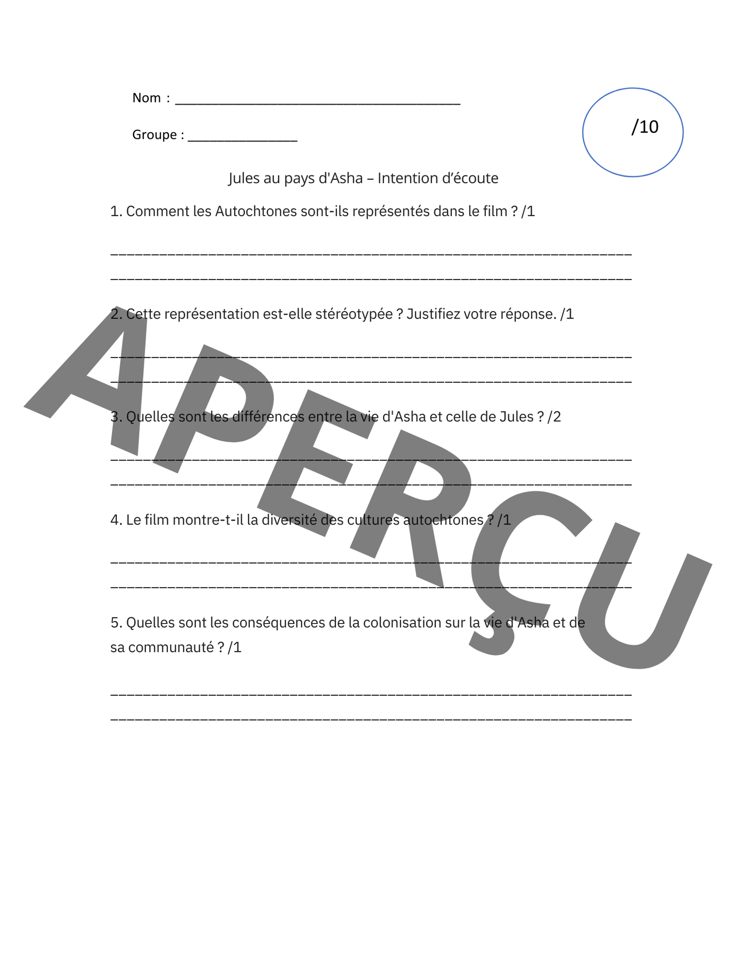 Questionnaire sur le film << Jules au pays d'Asha >> en lien avec le concept de citoyenneté et l'héritage culturel.