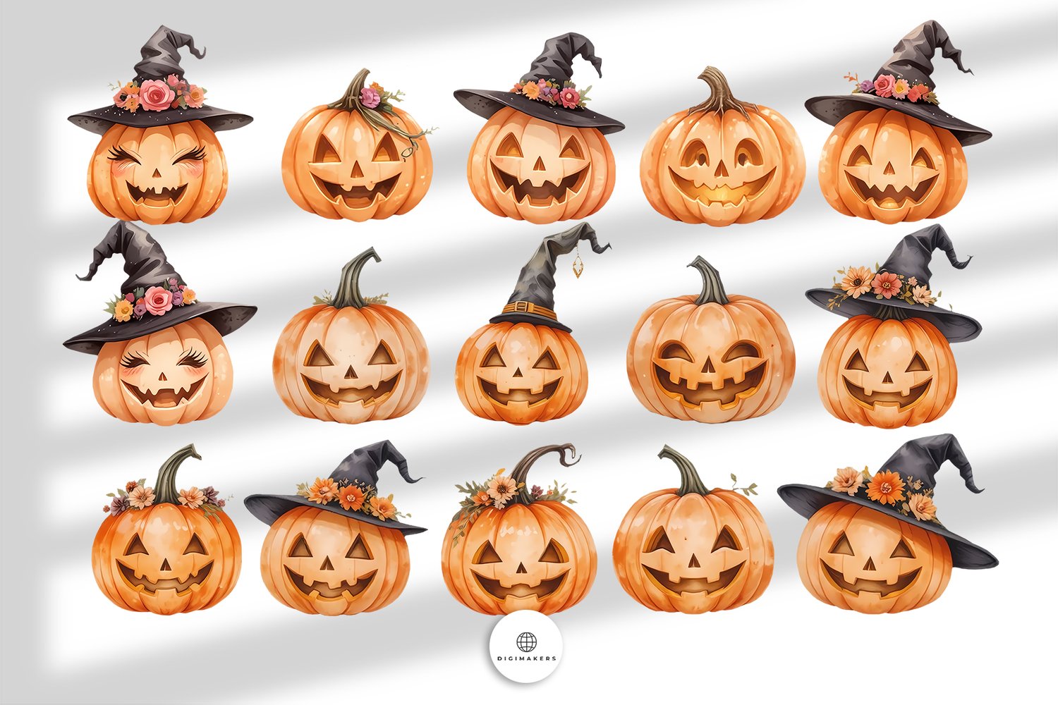 • Adorable Halloween Designs: These Cute Watercolor Halloween Pumpkins are illustrated with big eyes, hats, and playful expressions—ideal for adding a touch of