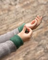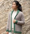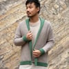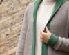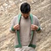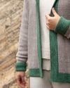 The Sausalito Cardigan is worked from the top-down beginning with a long provisional cast-on that spans across the length of both sleeves and the width of the back shoulders. Short rows are worked to shape the back shoulders in a seed stitch pattern. This texture is continued until the piece measures half the finished circumference of the sleeves, then the stitches are put on hold. The provisional cast-on is carefully undone for the left front and sleeve. The front pattern mirrors the back shoulder shaping and length. The right front and right sleeve are worked as a mirror of the left side. The front sleeve stitches are then connected to the back sleeve stitches using the Kitchener stitch, creating a seam along each sleeve. The remaining stitches for the fronts and back are connected and worked flat in seed stitch for the desired length of the body. At the bottom edge, a new color is introduced, and smaller needles are used to make a garter stitch border. Still using the smaller needles and contrast color, stitches are picked up along the inside edge of the fronts and back neckline to work a garter stitch shawl collar shaped with short rows. Last but not least, stitches are picked up and worked in the round along the cuff end of each sleeve to add a garter stitch edge that can be folded over for extra warmth.