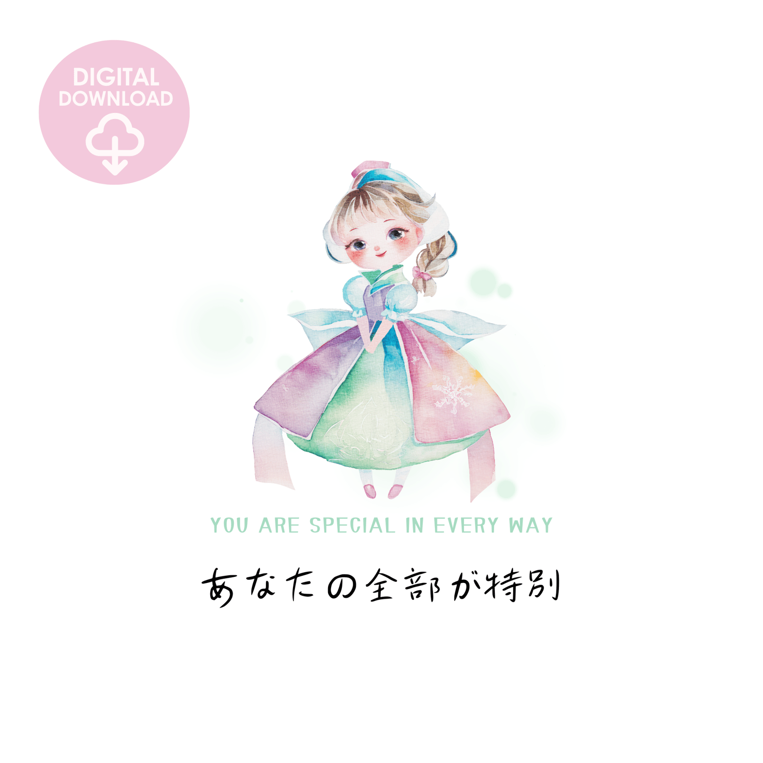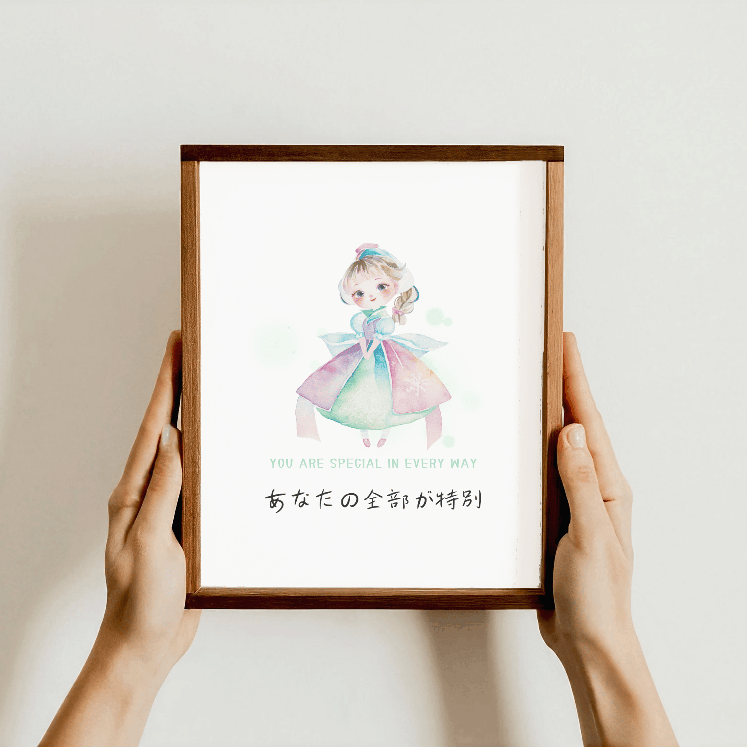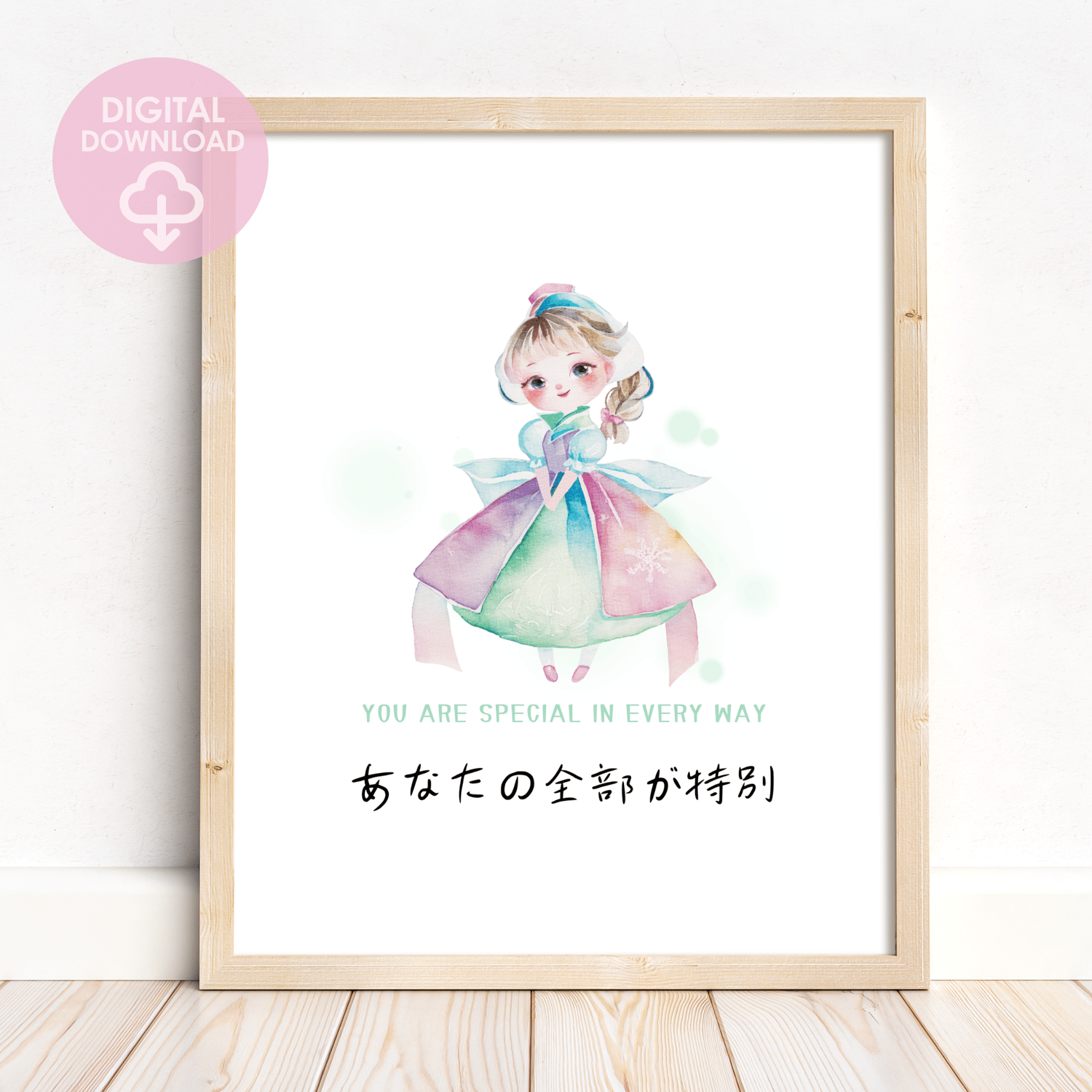 My printable wall art features a charming watercolor painting of a little princess, complete with the heartwarming quote "You Are Special in Every Way" in both English and Japanese. This dreamy and lovely artwork is designed to boost self-esteem and add a touch of magic to any girl's room. The high-quality digital file is easy to download and print, making it a perfect addition to your home decor.