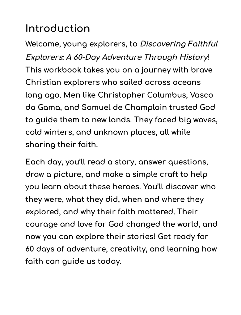 Discovering Faithful Explorers: A 60-Day Adventure Through History Join brave Christian explorers like Columbus and Champlain on a 60-day journey for 3rd graders! Read exciting stories, answer questions, draw pictures, and create simple crafts to learn who they were, what they did, and why their faith mattered. From ships to crosses, this workbook brings history to life with fun, hands-on activities that show how trust in God shaped a new world. Perfect for classrooms or home, it’s an adventure in courage and faith!
