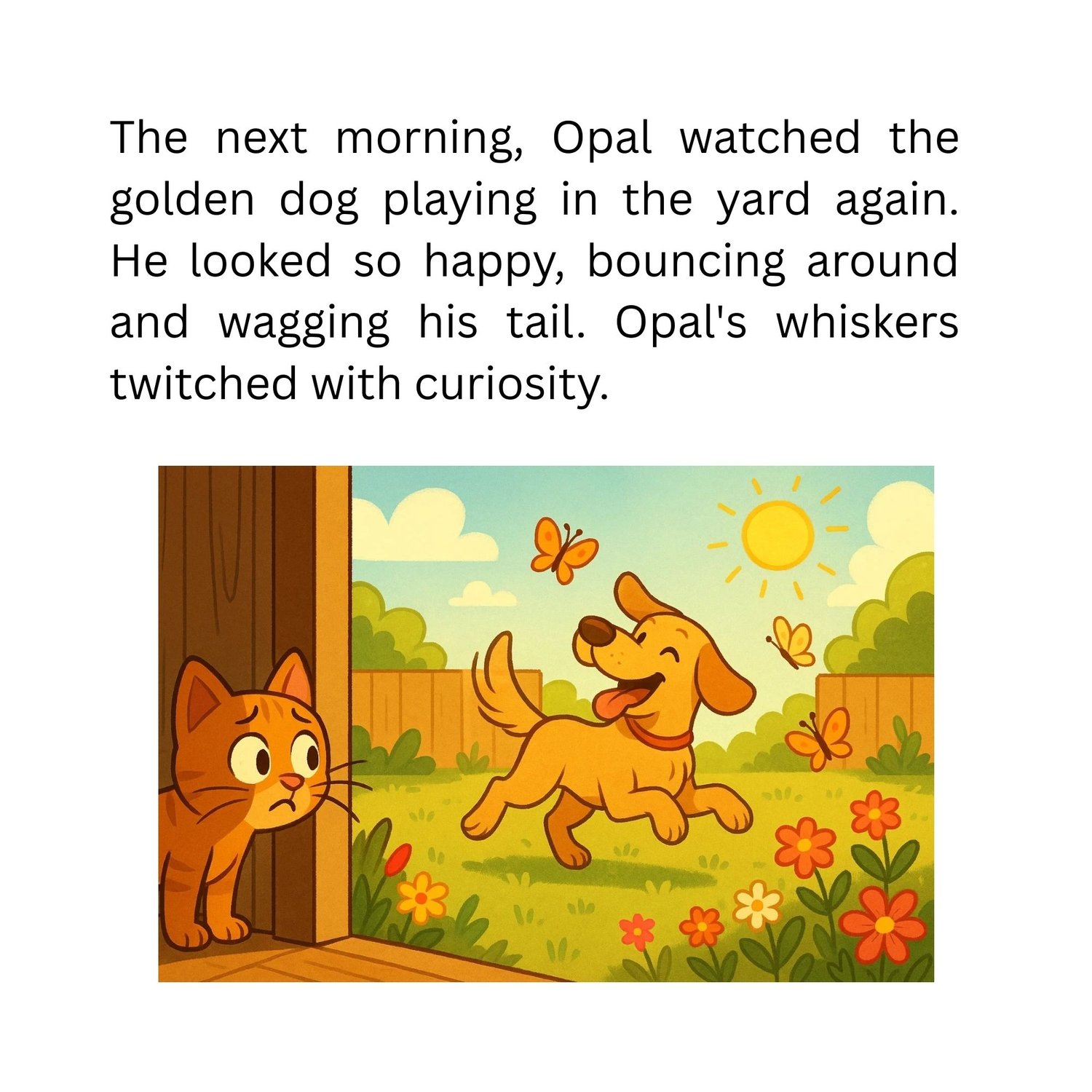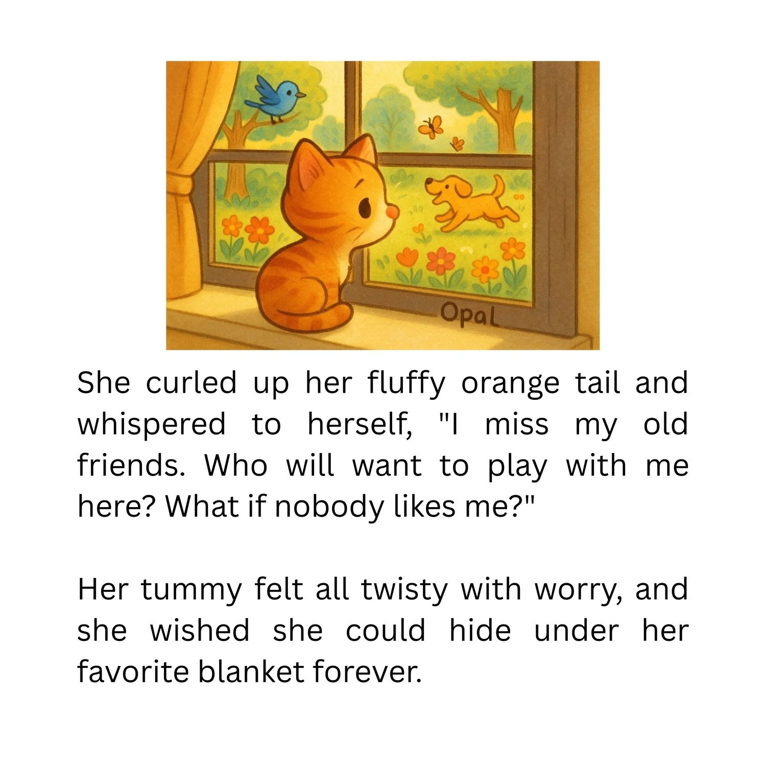Opal is a curious orange kitten who has just moved to a new home. At first, she feels lonely… until she discovers the magic of reaching out with kindness. With the help of Buddy the dog, Ruby the bird, and Clover the bunny, Opal learns that friendship begins with a simple: