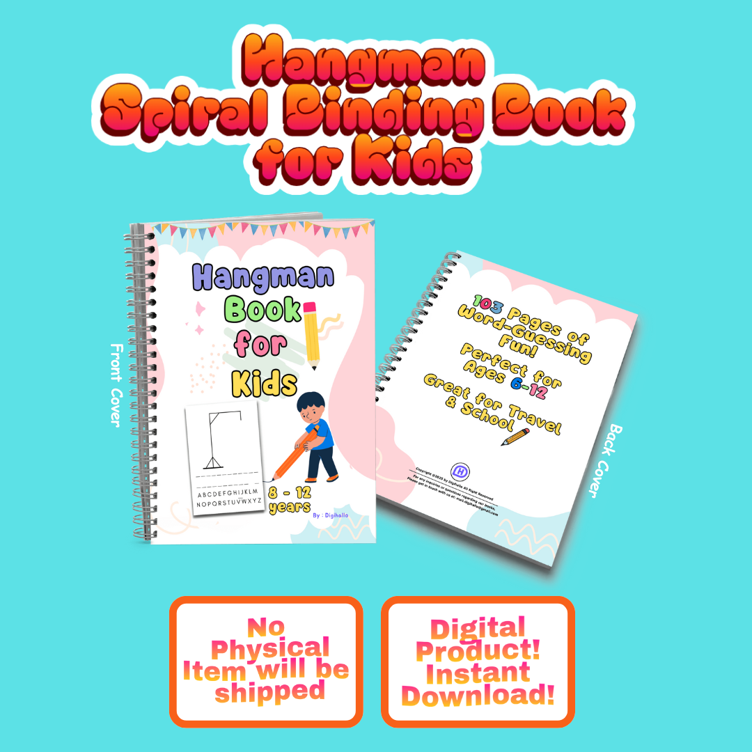 (A) Download and print the pages, then bind them using a spiral coil binding machine or at a local print shop. Kids can play the classic hangman word game by choosing a word, marking the blanks, and letting others guess letters while drawing the hangman figure for incorrect guesses. It's perfect for road trips, quiet time activities, or fun learning sessions at home or school.