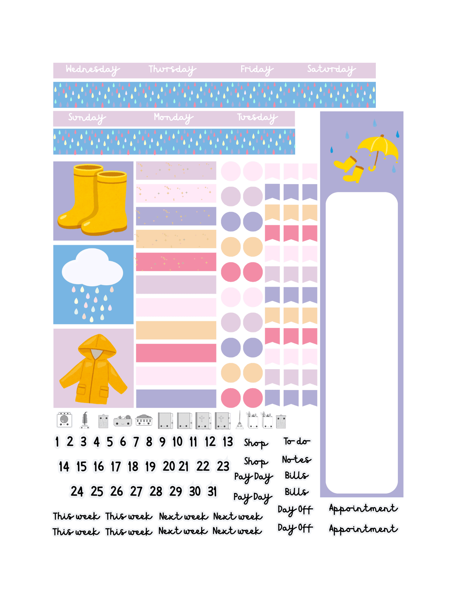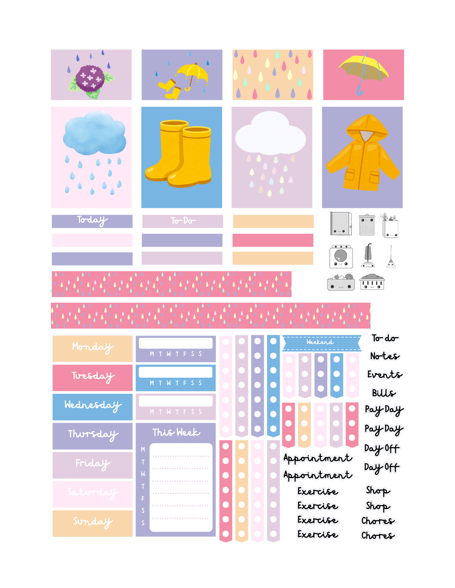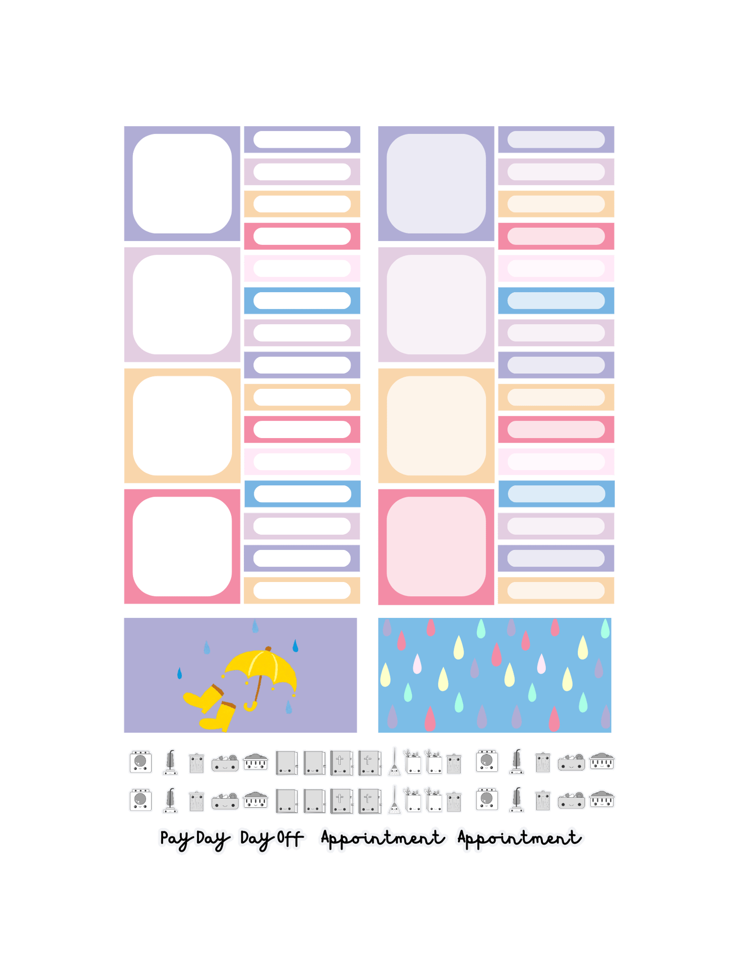 April Showers – Pastel Rainy Day – Printable Monthly Planner Sticker Kit – Standard Vertical – Pastel Rain Theme