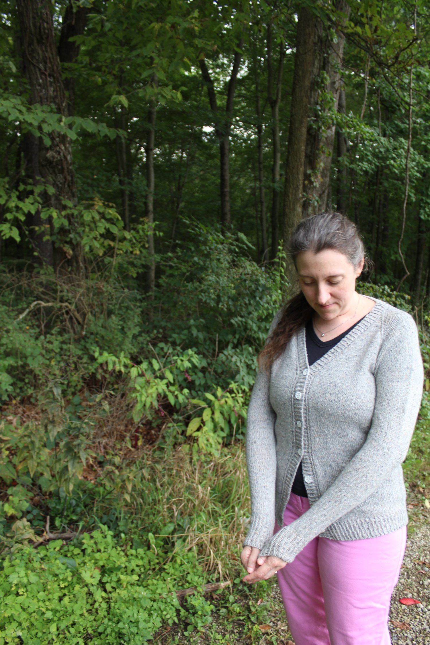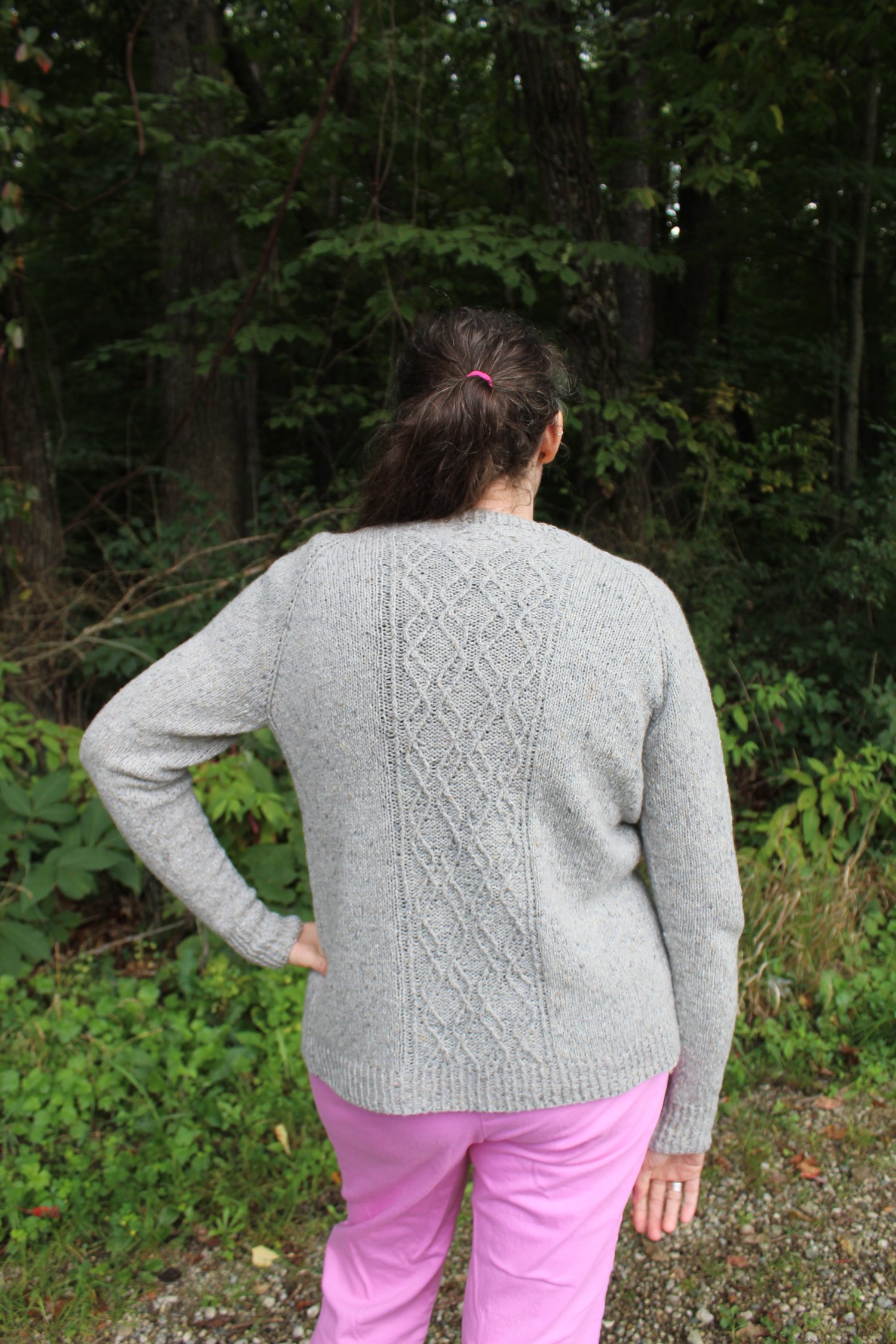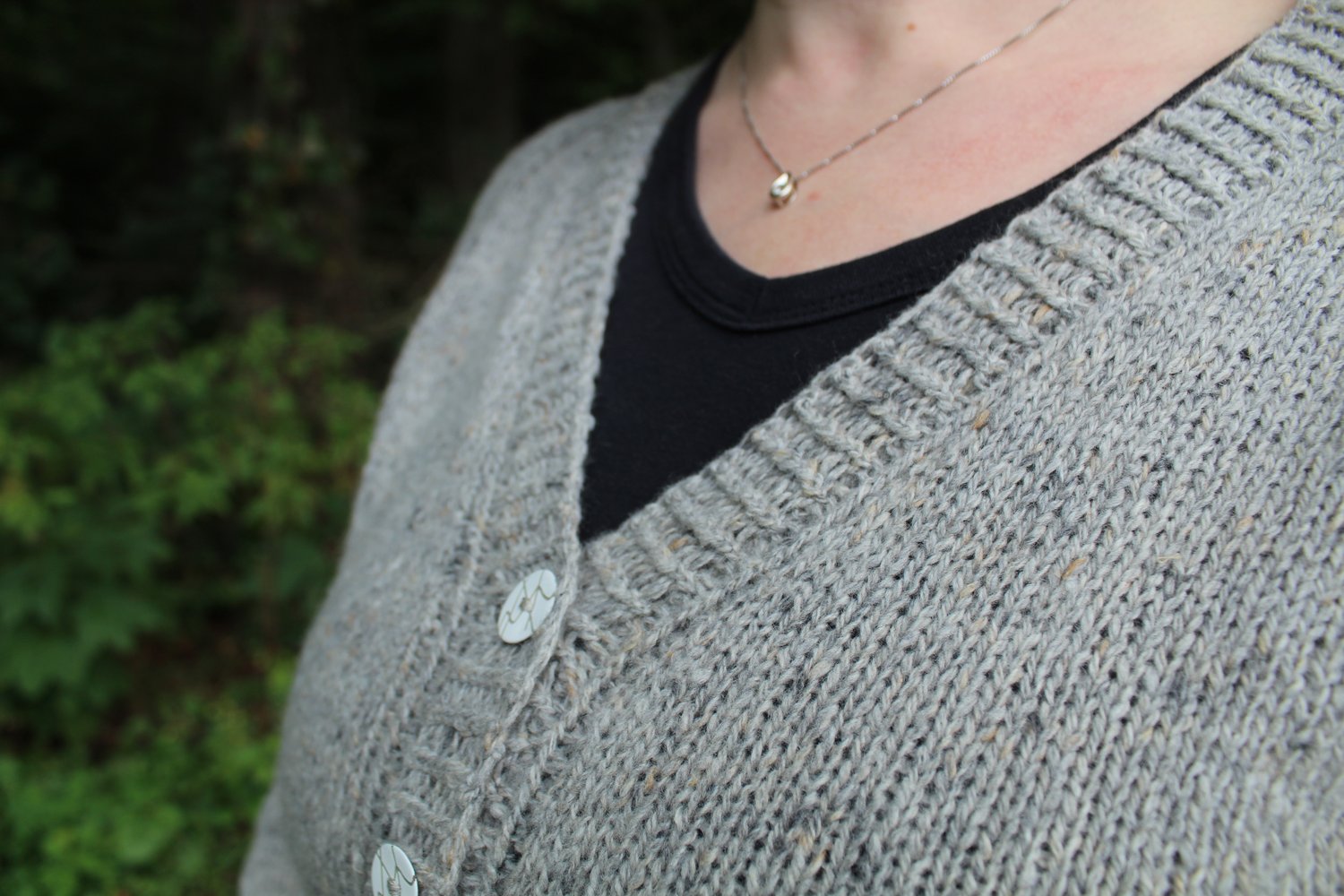Oscillation is my go-to cardigan, perfect for every situation. It’s knit from the top down, seamlessly, with raglan shaping, and a flattering V-neck. Knit with fingering weight yarn, it’s a beautifully versatile layering piece. It has a gorgeous twisted stitch cable pattern down the back, and a fun twisted stitch detail along the raglan seams which continues down the sides. Knit in Dimond Laine Elmer Tweed Fingering, it’s lightweight and buttery soft with a lovely tweed texture.