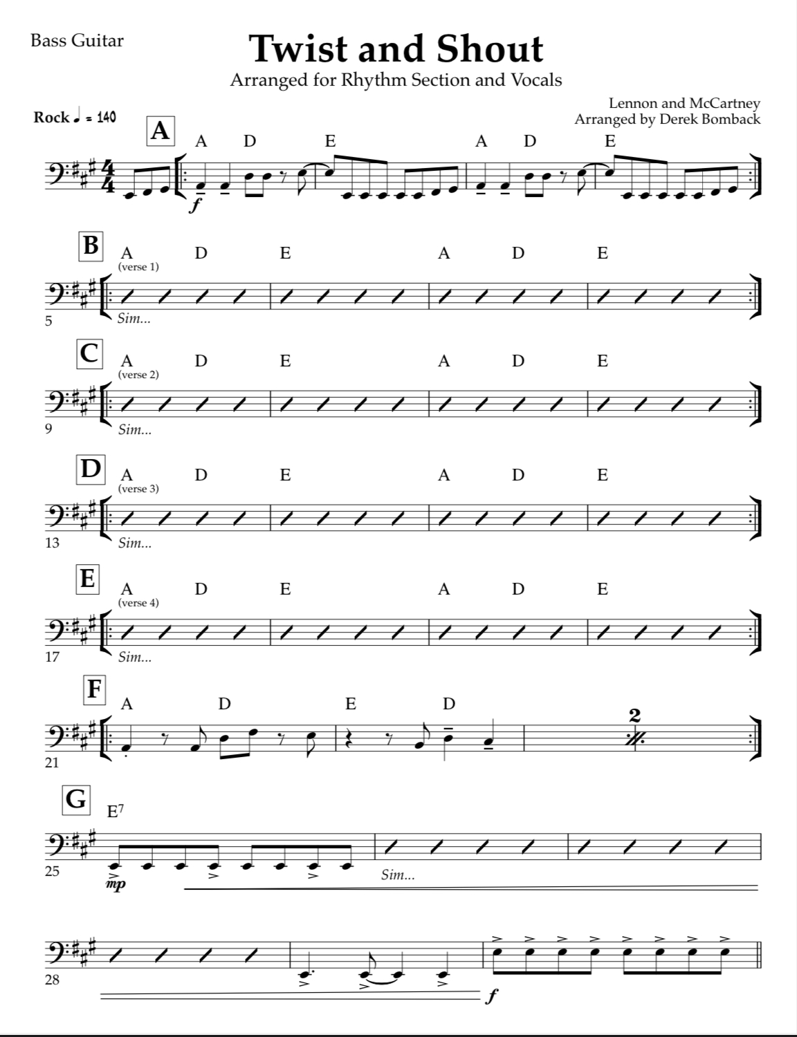 Twist and Shout by The Beatles. Key of A major. Arranged for Guitar, Keyboard, Bass Guitar, Drum Set and Voice (Lyric Sheet).