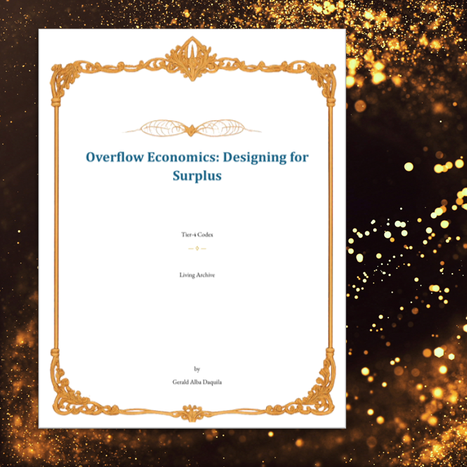 The T4 Codex introduces "Overflow Economics," emphasizing surplus as a vibrant, circulatory system instead of mere financial excess. It outlines the roles of stewards in channeling vibrational and resource surpluses, integrating them into systems to foster communal growth. Key principles focus on resonance, transparency, and unconditional giving.