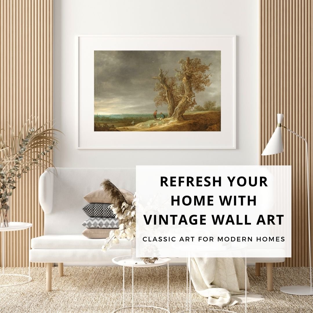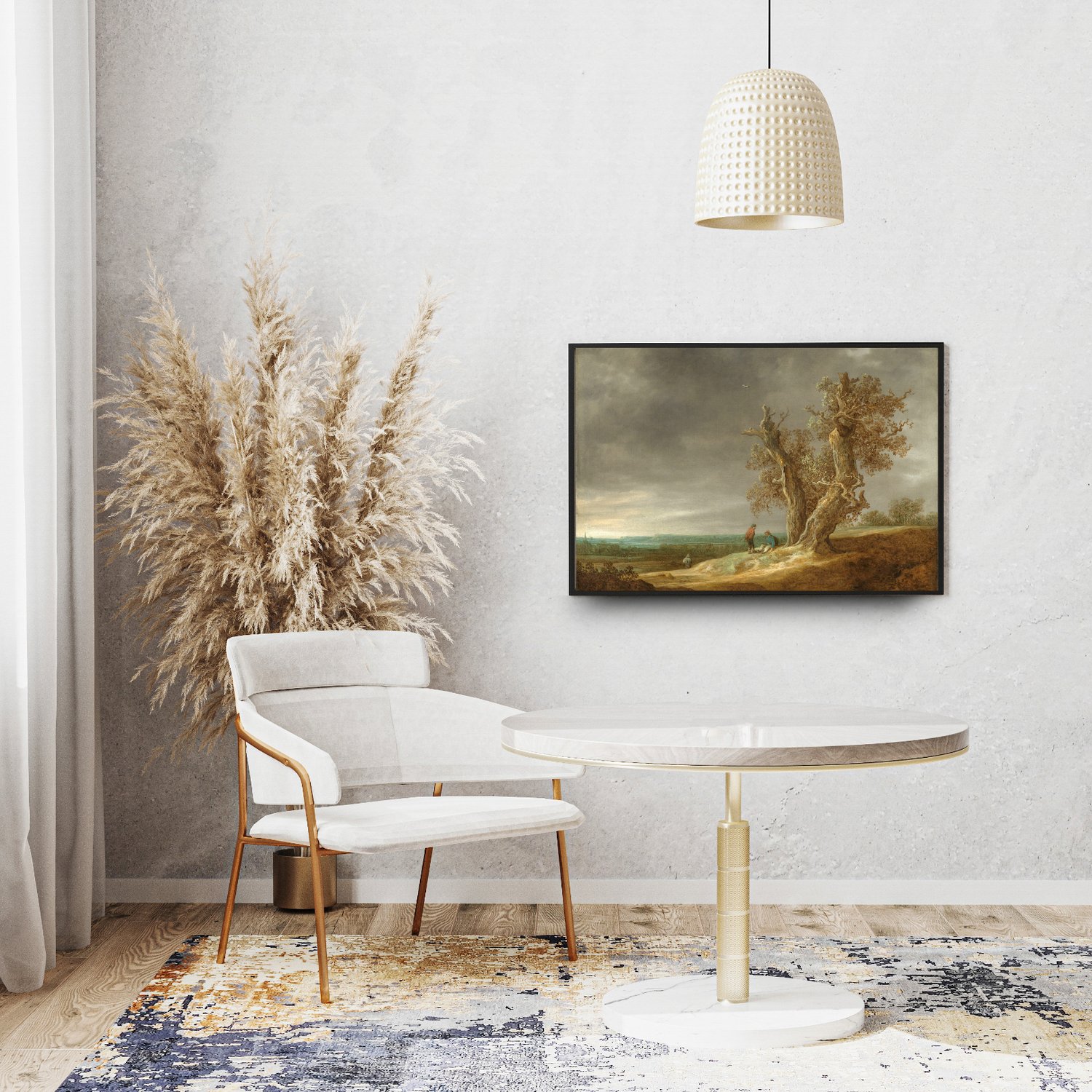 This piece by Jan van Goyen, Landscape with Two Oaks, 1641, celebrate the elegance of simplicity with its striking composition. The grandeur of the oaks brings a touch of nature indoors, making it a compelling focal point. Let it inspire a sense of calm in your home where it can fit seamlessly into any décor style, whether you’re aiming for classic elegance or modern simplicity.