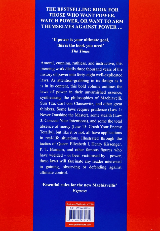 Drawn from 3,000 years of the history of power, this is the definitive guide to help readers achieve for themselves what Queen Elizabeth I, Henry Kissinger, Louis XIV and Machiavelli learnt the hard way. Law 1: Never outshine the master Law 2: Never put too much trust in friends; learn how to use enemies Law 3: Conceal your intentions Law 4: Always say less than necessary. The text is bold and elegant, laid out in black and red throughout and replete with fables and unique word sculptures. The 48 laws are illustrated through the tactics, triumphs and failures of great figures from the past who have wielded - or been victimised by - power.