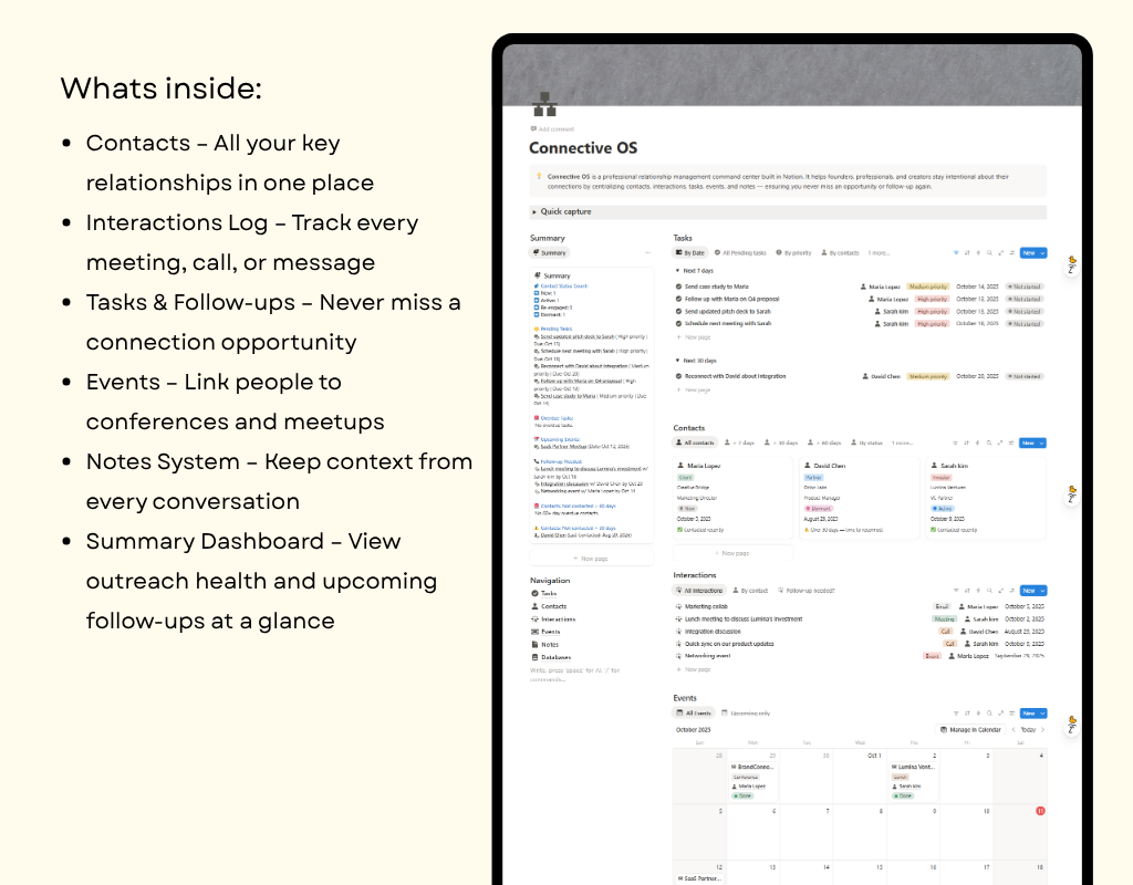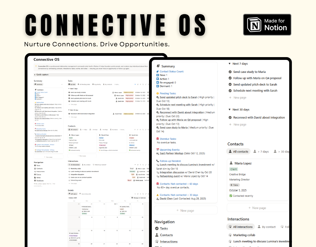 Connective OS centralizes all your relationship management workflows into one powerful Notion workspace. By connecting Contacts, Interactions, Tasks, Events, and Notes, it gives you a complete picture of your network at a glance.