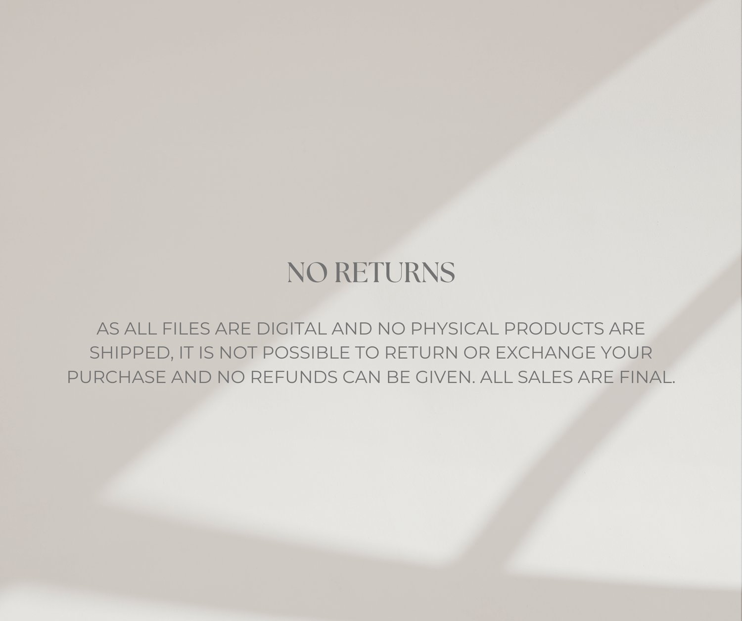 - NO RETURNS, as all files are digital and no physical products are shipped, it is not possible to return or exchange your purchase and no refunds can be given. All sales are final.