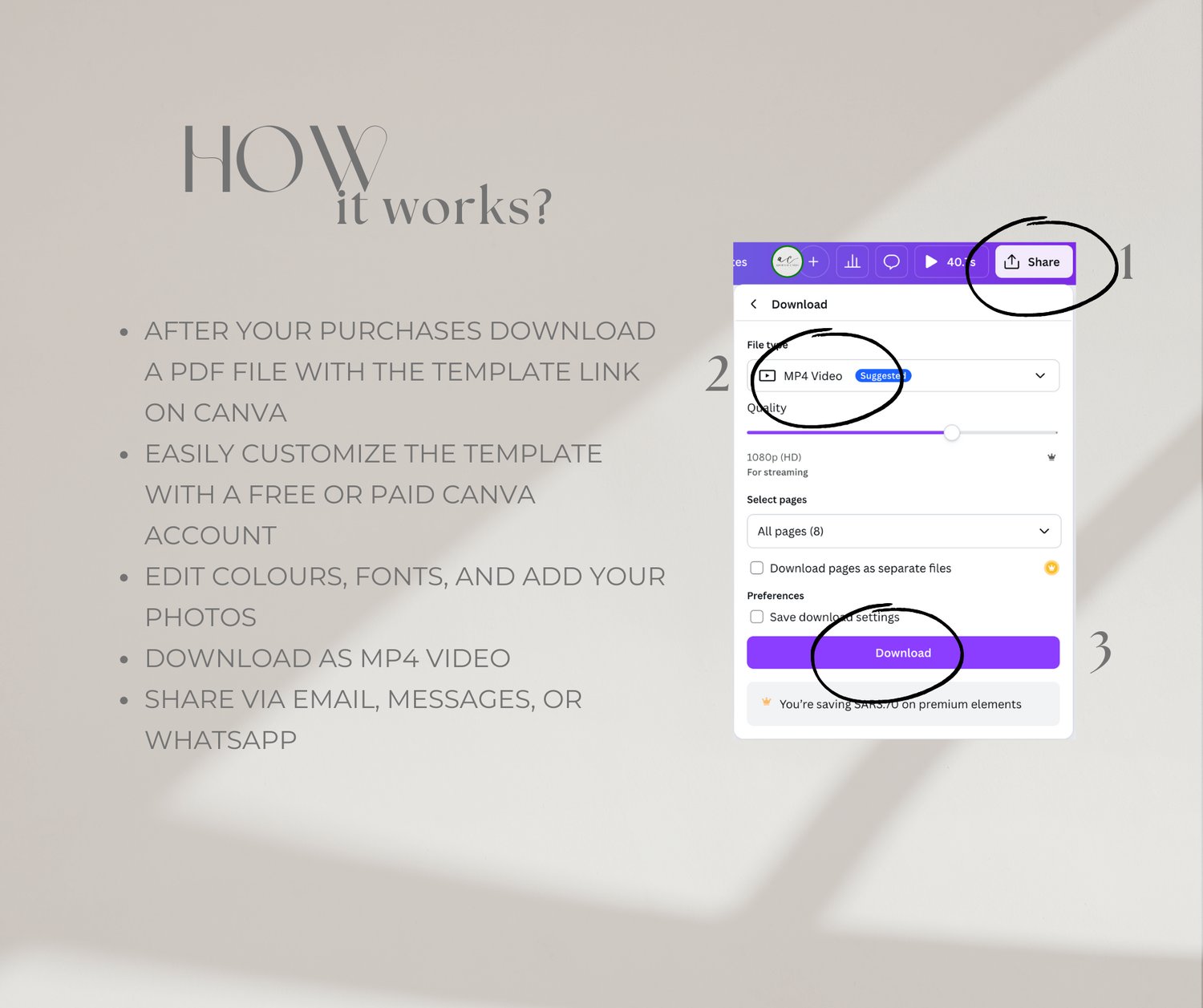 4. Download the template as a PDF for printing, or as a PNG or JPEG for images, or as an MP4 for videos, and then share it digitally.