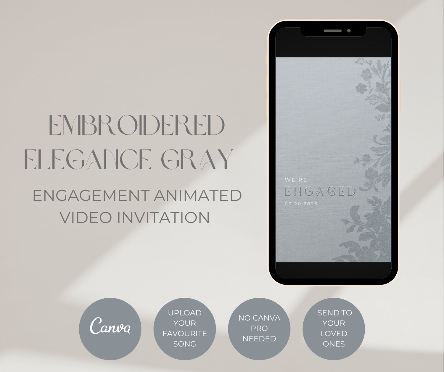 Embroidered Elegance Gray Engagement Invitation Canva Template