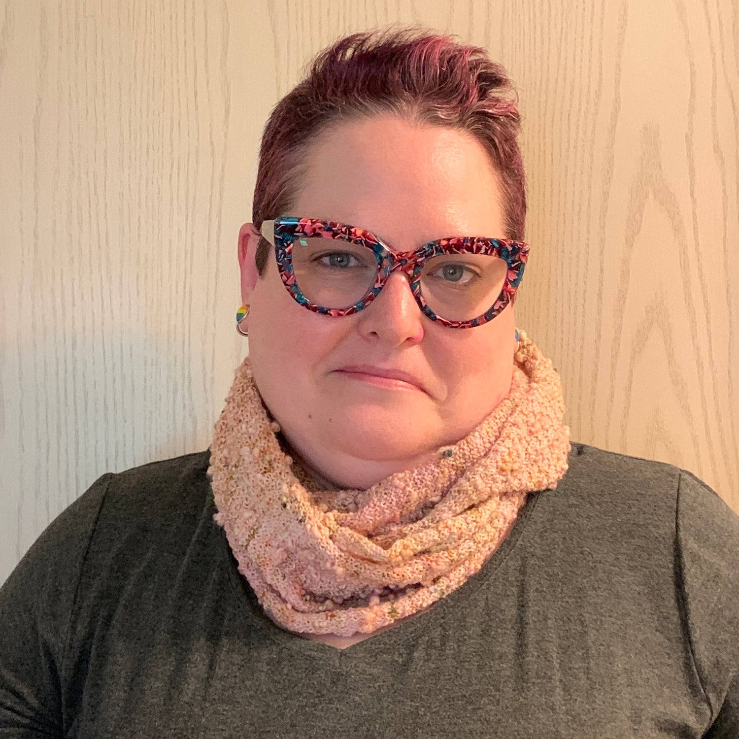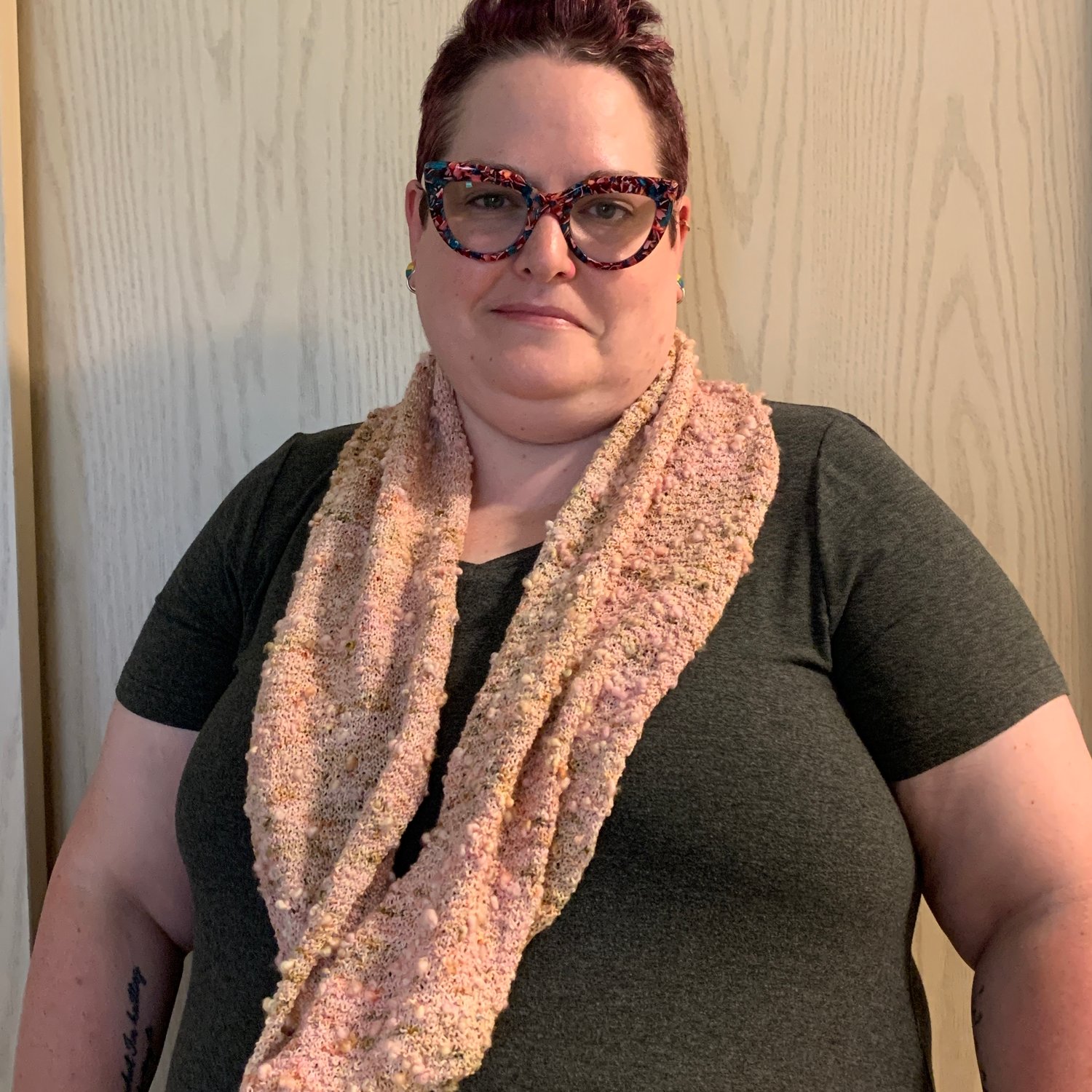 This cowl pattern is the companion piece to a sock pattern that uses textured stitches that remind me of lots of tiny cherries. The colourway I used for the sock pattern is Cherry Blossoms V2.0. Since this cowl pattern uses the same textured pattern, I gave it the same name. The floofy yarn used for this cowl also gives the look of cherries.