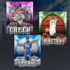 Boost your sports marketing with this vibrant set of Photoshop templates for cheer, basketball, and baseball. Each design is tailored to showcase the energy of each sport with vivid graphics and personalization options. Perfect for promotional material, these templates will highlight school spirit and celebrate student athletes with style and excitement. Offer them to clients looking to make their teams shine.