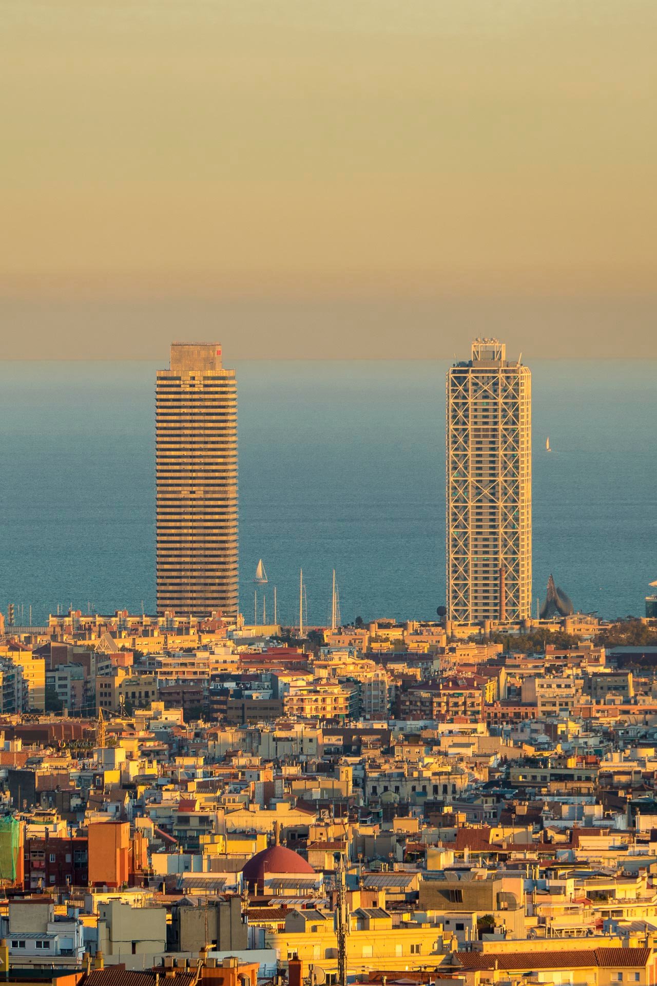 The city of Barcelona, the two towers of the Olympic port and in the background the sea and pollution