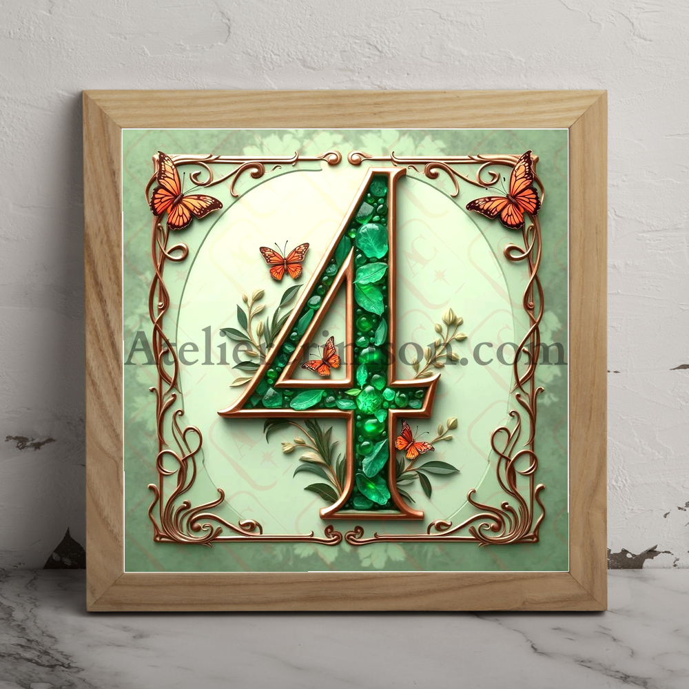 Number 4 emerald and copper Art Nouveau Intricate design with floral patterns, butterflies, and vines. Elegant sage green background. Perfect for vintage lovers and typography enthusiasts.