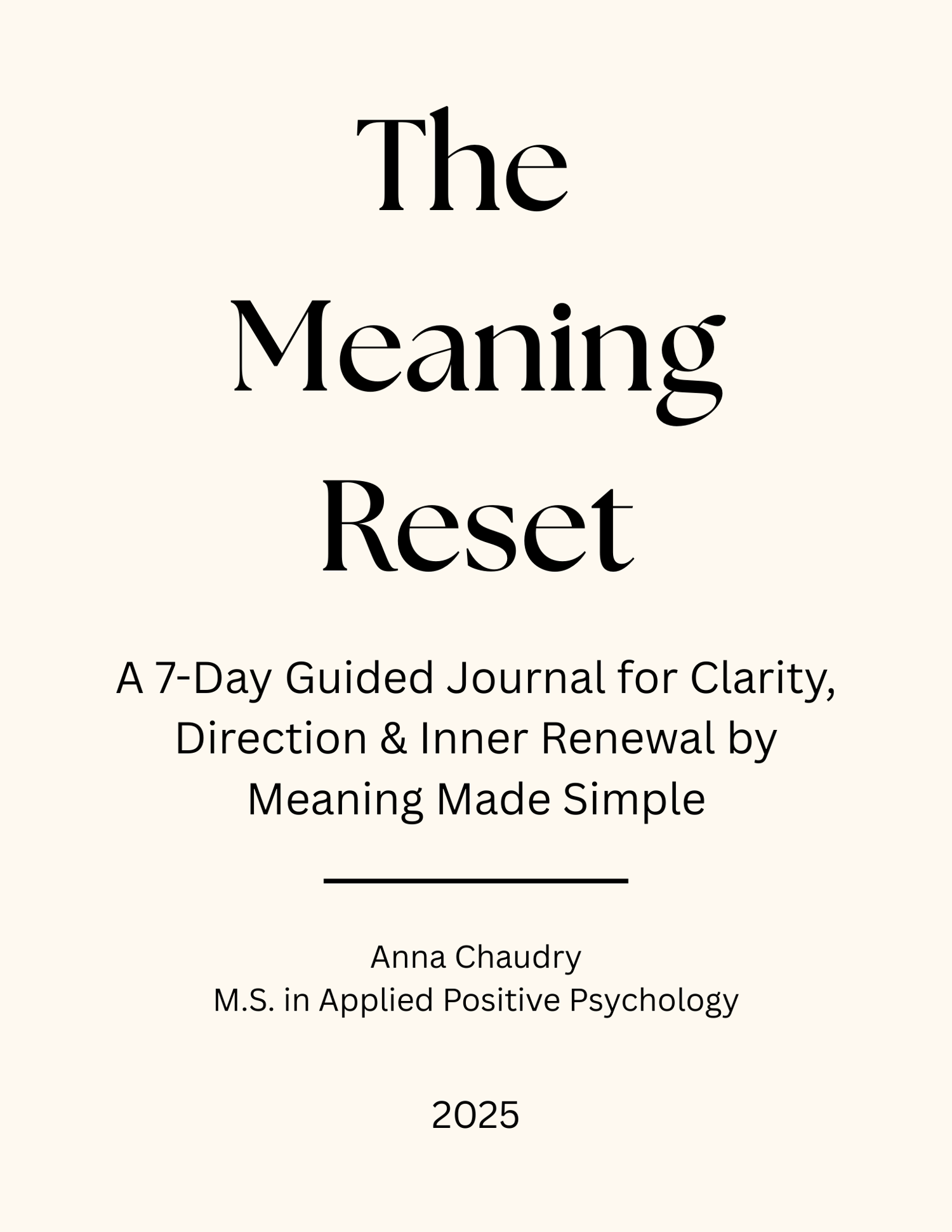 The Meaning Reset is a beautifully designed, research-backed guided journal that helps you reconnect with what truly matters. Over the course of 7 intentional days, you’ll move from confusion to clarity through daily prompts rooted in positive psychology.