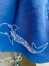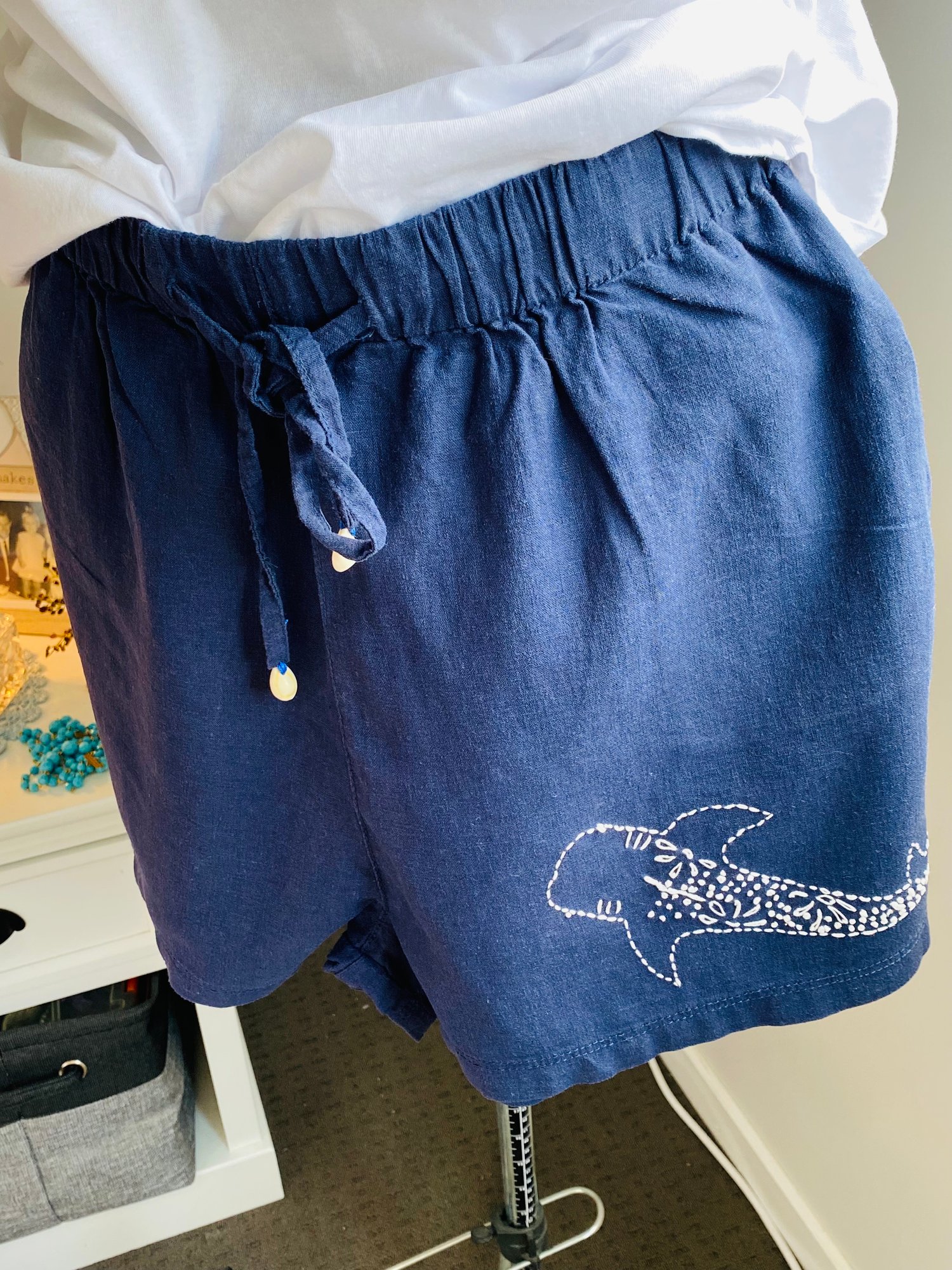These beautiful shorts are designed and embroidered by Karen, with only one of each design ever made. No repeats, no replicas—just exclusive, collectible fashion art. Inspired by the underwater world, the organic shapes, bold colours, and marine themes echo the movement and energy of ocean ecosystems, transforming sea life into striking fashion statements. They match perfectly with the Navy Blue Whale Shark T-shirt if you wish to have a matching set. A discount at checkout is provided if you wish to purchase both.