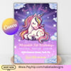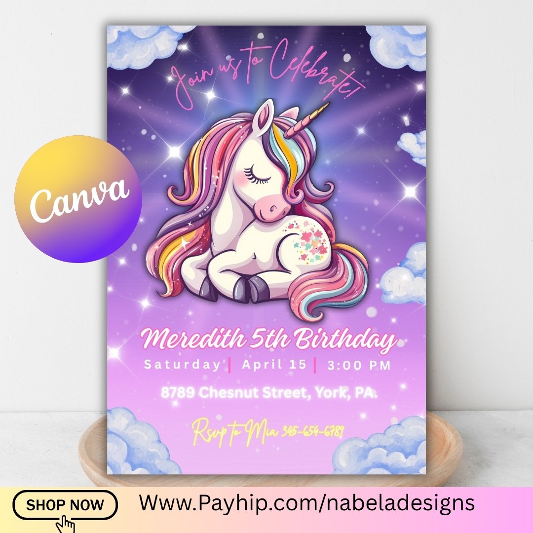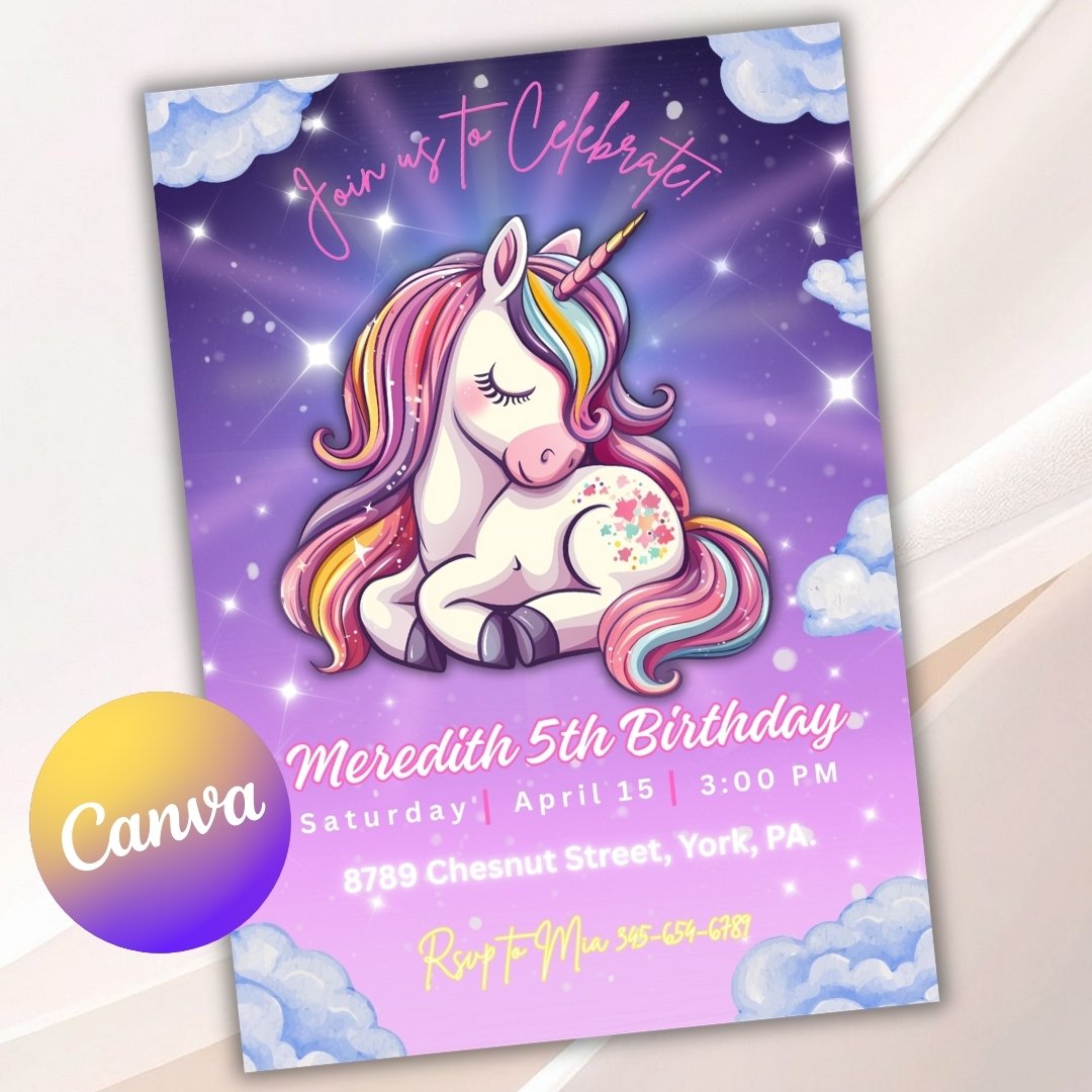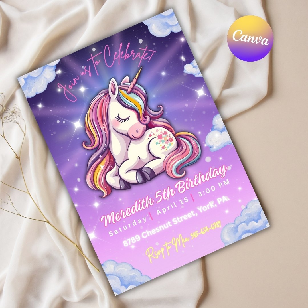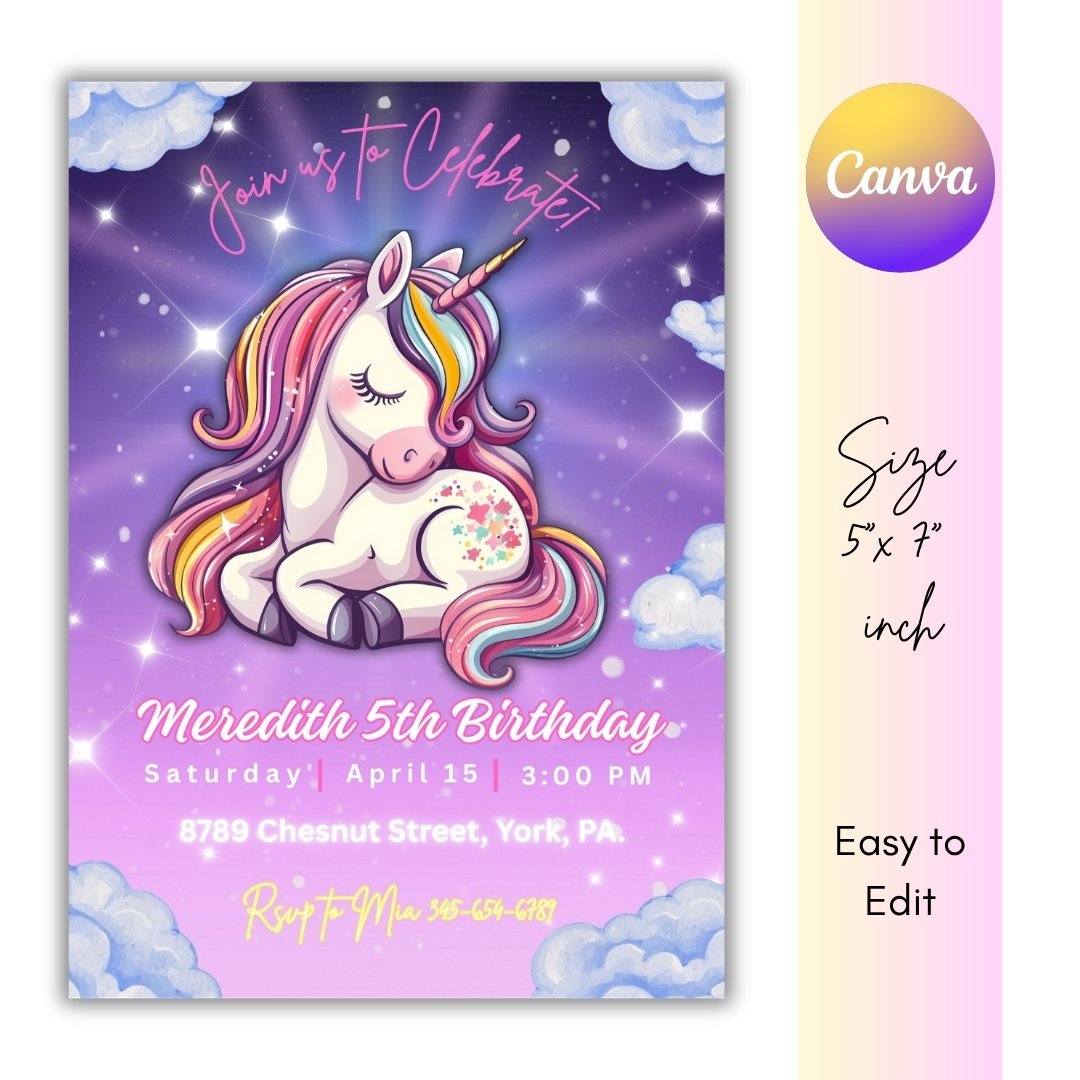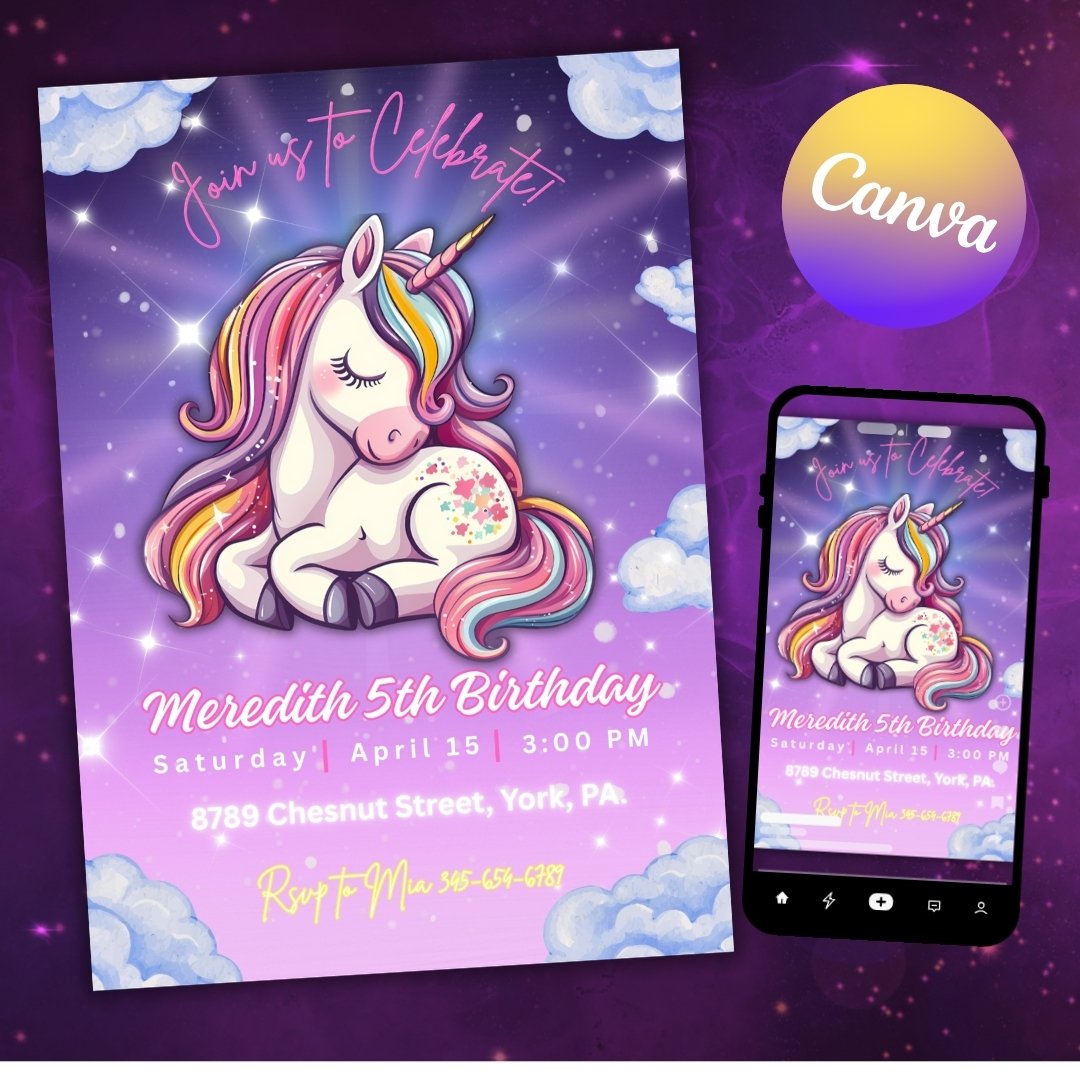 Make your little one’s birthday extra special with this unicorn birthday invitation! 💕 Easily edit in Canva—no design skills needed. This printable invite is perfect for a magical unicorn party theme and can be used as a digital or printed invitation.