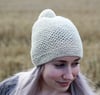 A quick and funky hat with interesting stamen stitch texture. little tucks at the back to make it sit on your head perfectly, and a fluffy pompom.