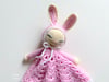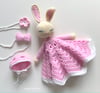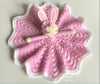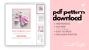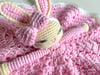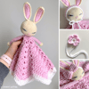 The PDF pattern file is a DIY tutorial that includes complete written instructions for the bunny lovey and each of her three accessories, photo references for the crocheted parts, and step-by-step explanations for finishing details.