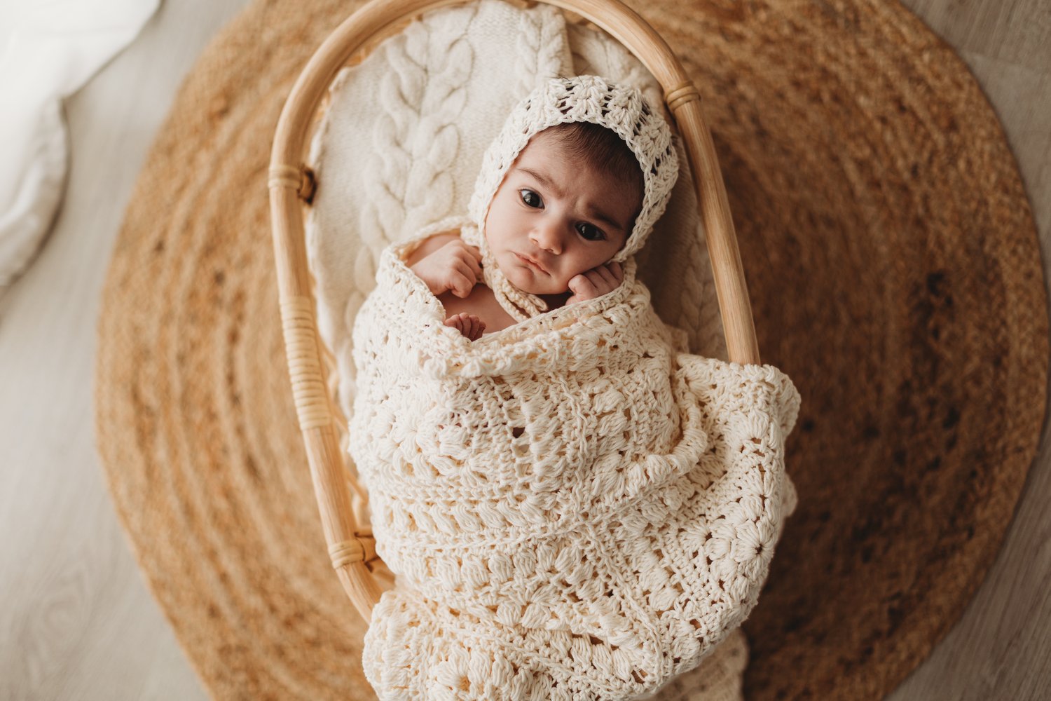 Granny Squares Crochet Baby Blanket Ester with an elegant baby bonnet.