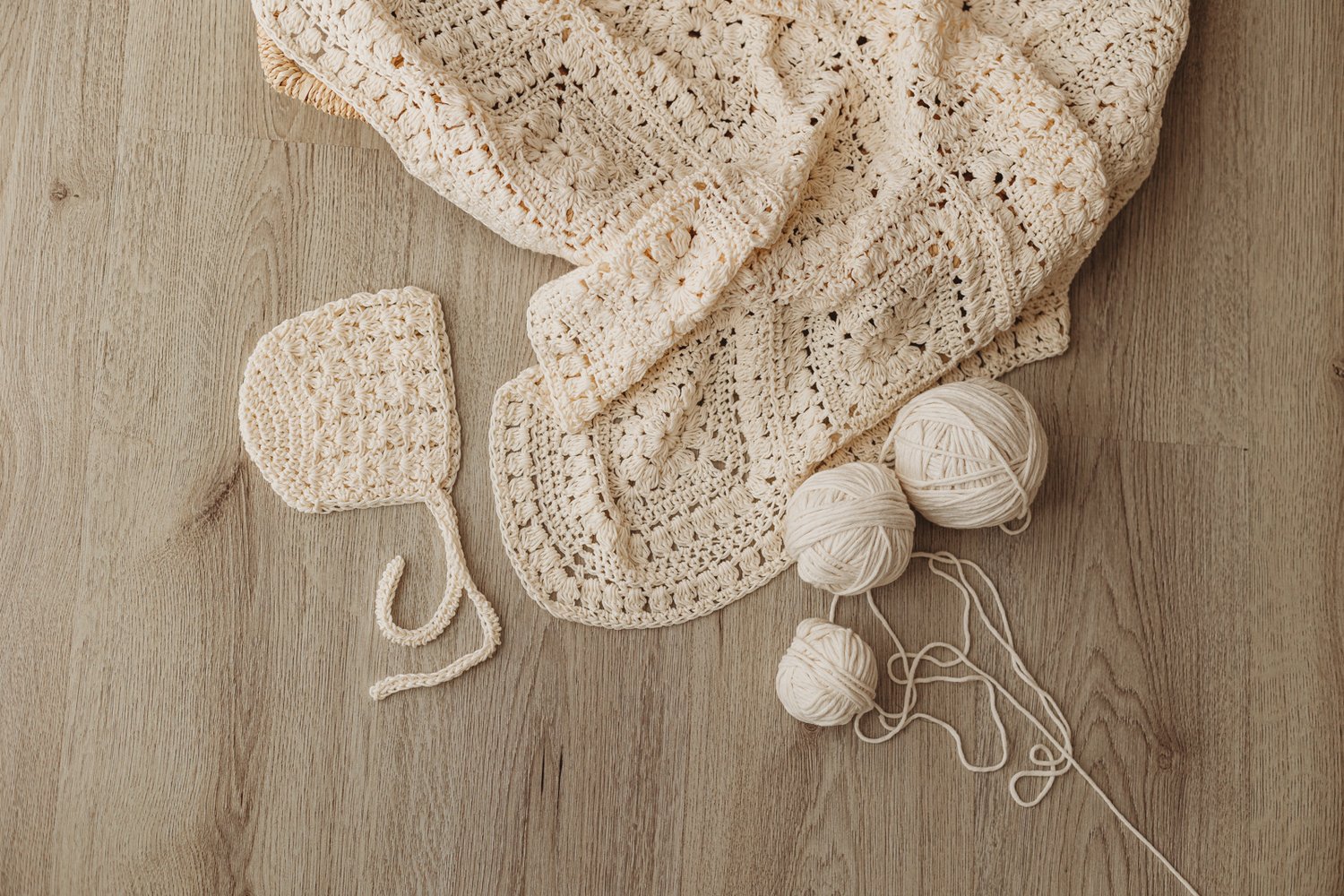 Airy and cozy summer blanket and hat (or a 4-seasons blanket if made in merino wool). Fantastic new baby gift idea and stunning newborn photo prop.