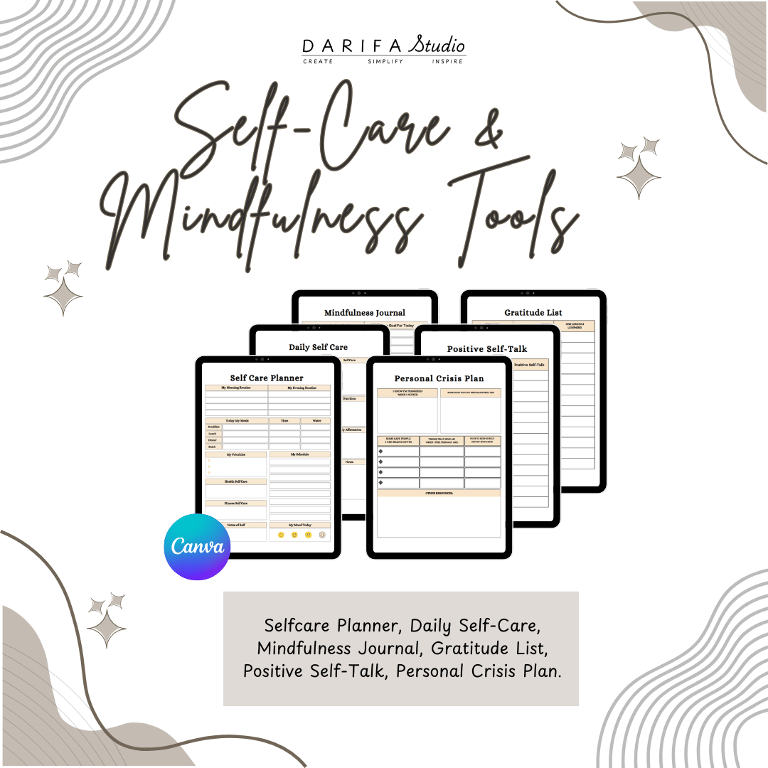 - Self-Care & Mindfulness Tools: Selfcare Planner, Daily Self-Care, Mindfulness Journal, Gratitude List, Positive Self-Talk, Personal Crisis Plan.