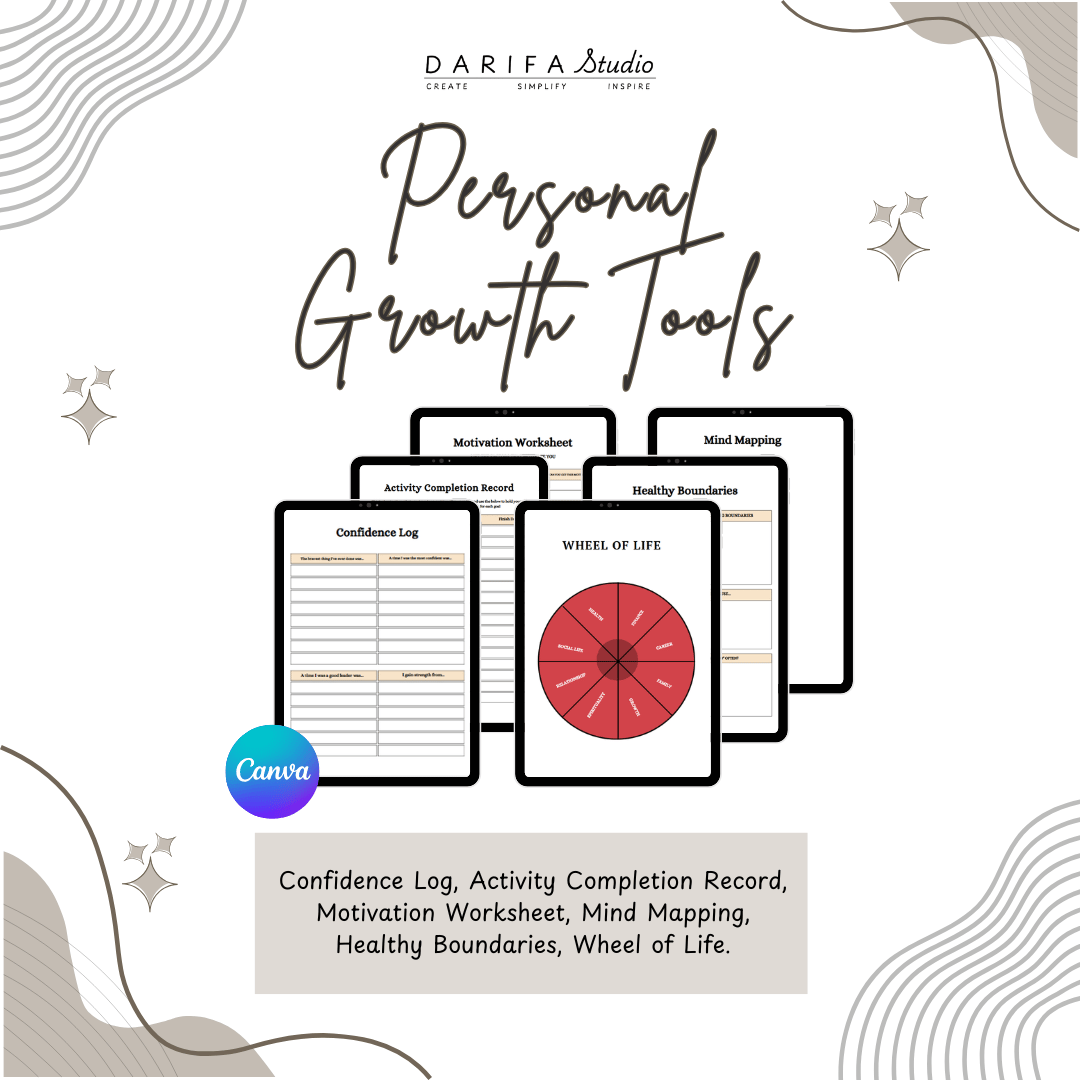 - Personal Growth Tools: Confidence Log, Activity Completion Record, Motivation Worksheet, Mind Mapping, Healthy Boundaries, Wheel of Life.