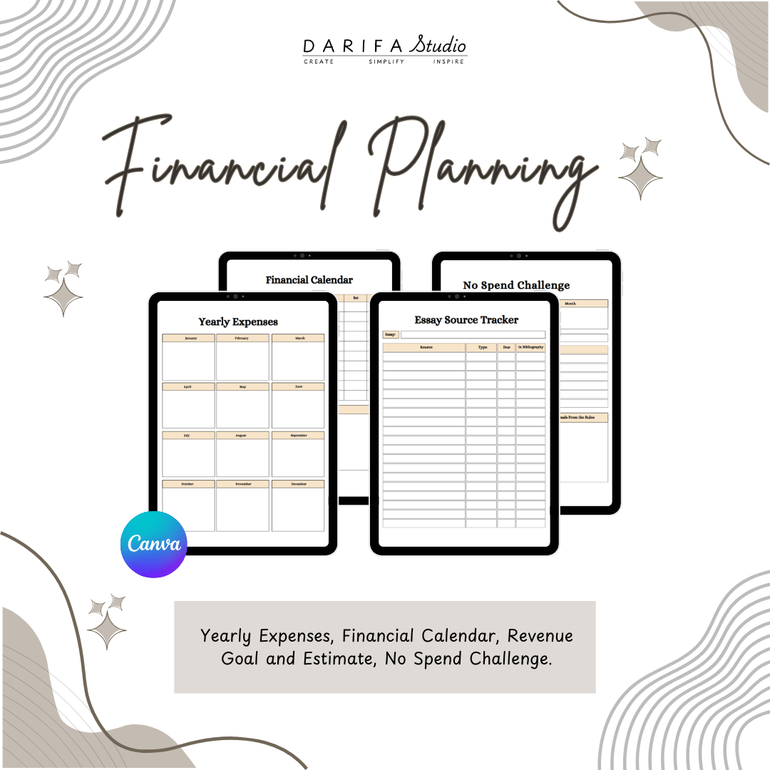 - Financial Planning: Yearly Expenses, Financial Calendar, Revenue Goal and Estimate, No Spend Challenge.