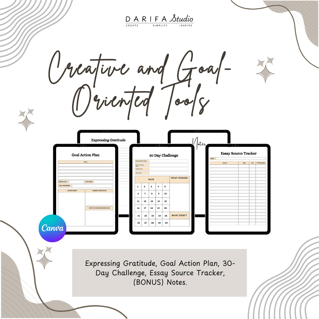 - Creative and Goal-Oriented Tools: Expressing Gratitude, Goal Action Plan, 30-Day Challenge, Essay Source Tracker.