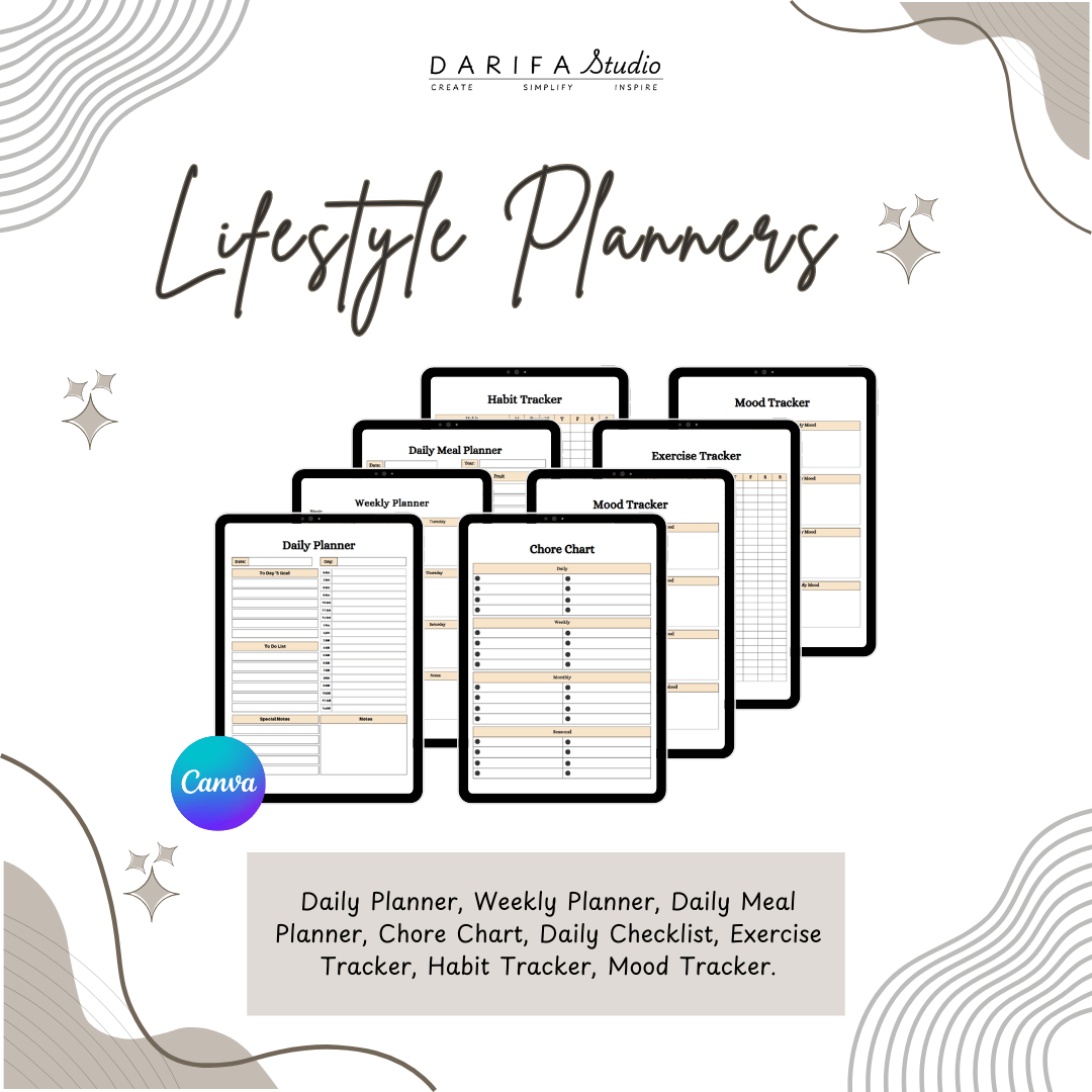 - Lifestyle Planners: Daily Planner, Weekly Planner, Daily Meal Planner, Chore Chart, Daily Checklist, Exercise Tracker, Habit Tracker, Mood Tracker.