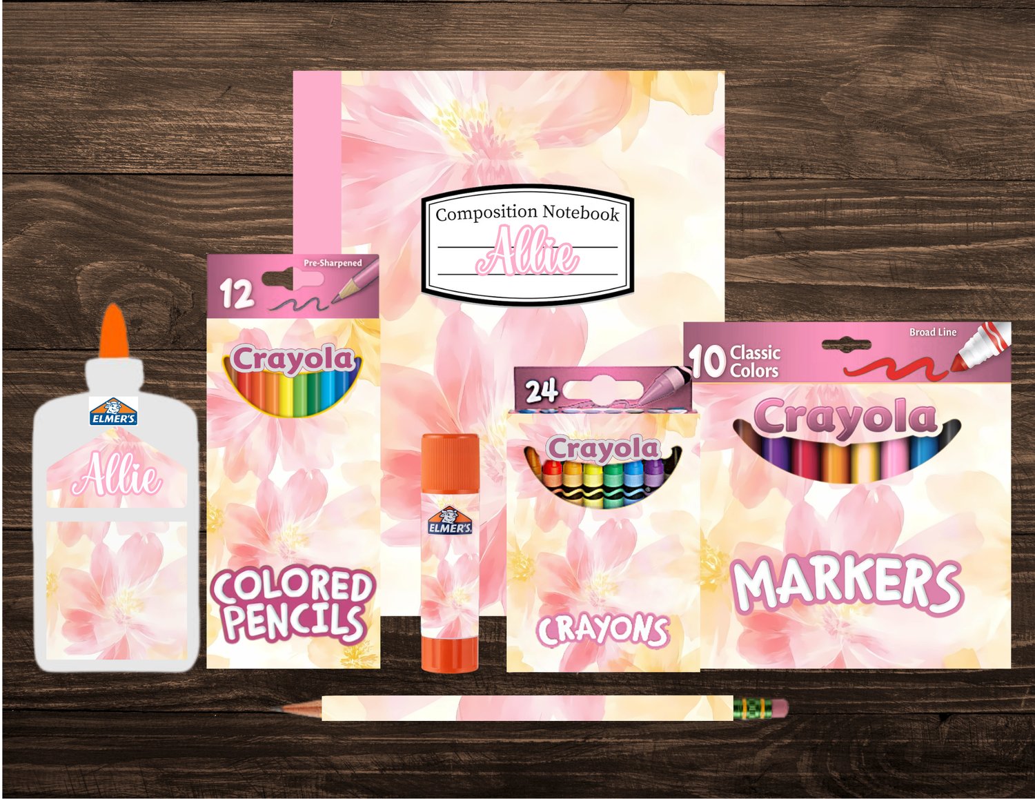 Personalized Pink Floral School Supply Set | Custom Back-to-School Essentials for Girls | Includes Notebook, Crayons, Glue, and More!