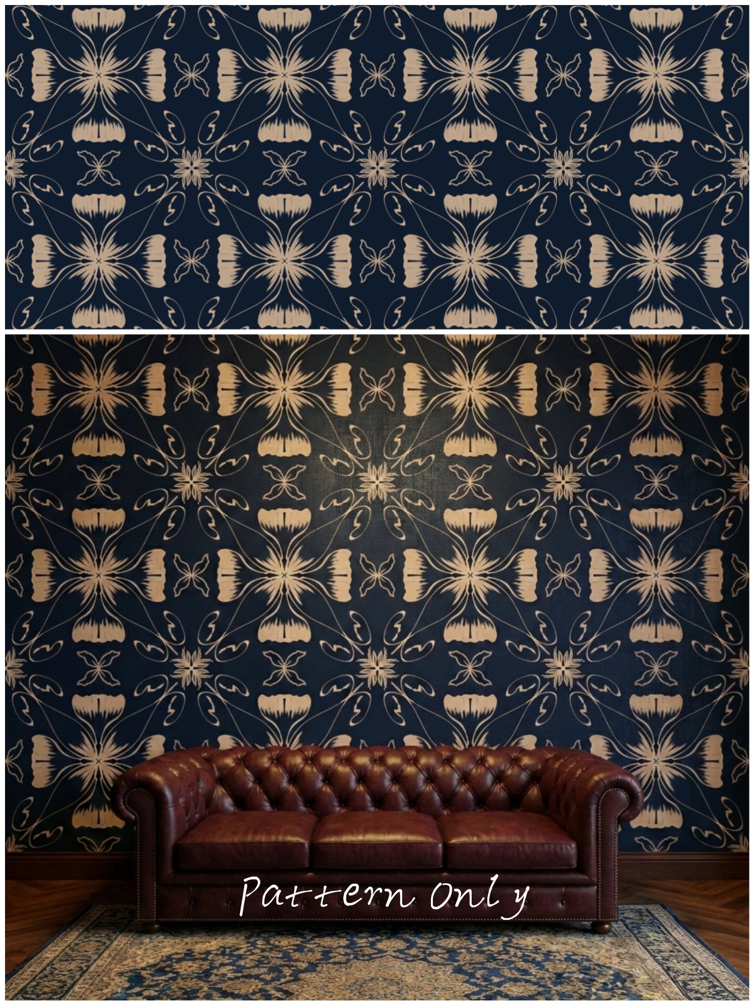 A bold and dramatic seamless pattern featuring vintage-inspired ornamental motifs in beige over a deep navy background. This design brings timeless European elegance with a strong symmetrical structure, making it perfect for wallpaper, upholstery, statement decor, and fashion accessories.