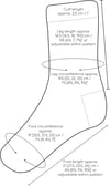 The socks come in four sizes for the foot (58, 62, 66, and 70 stitches) and three for the leg (56, 64, and 72 stitches) with adjustable foot and leg length. Right and left socks are identical and can be worked two-at-a-time up to a point. A little stitch re-adjustment is needed right above the heel.