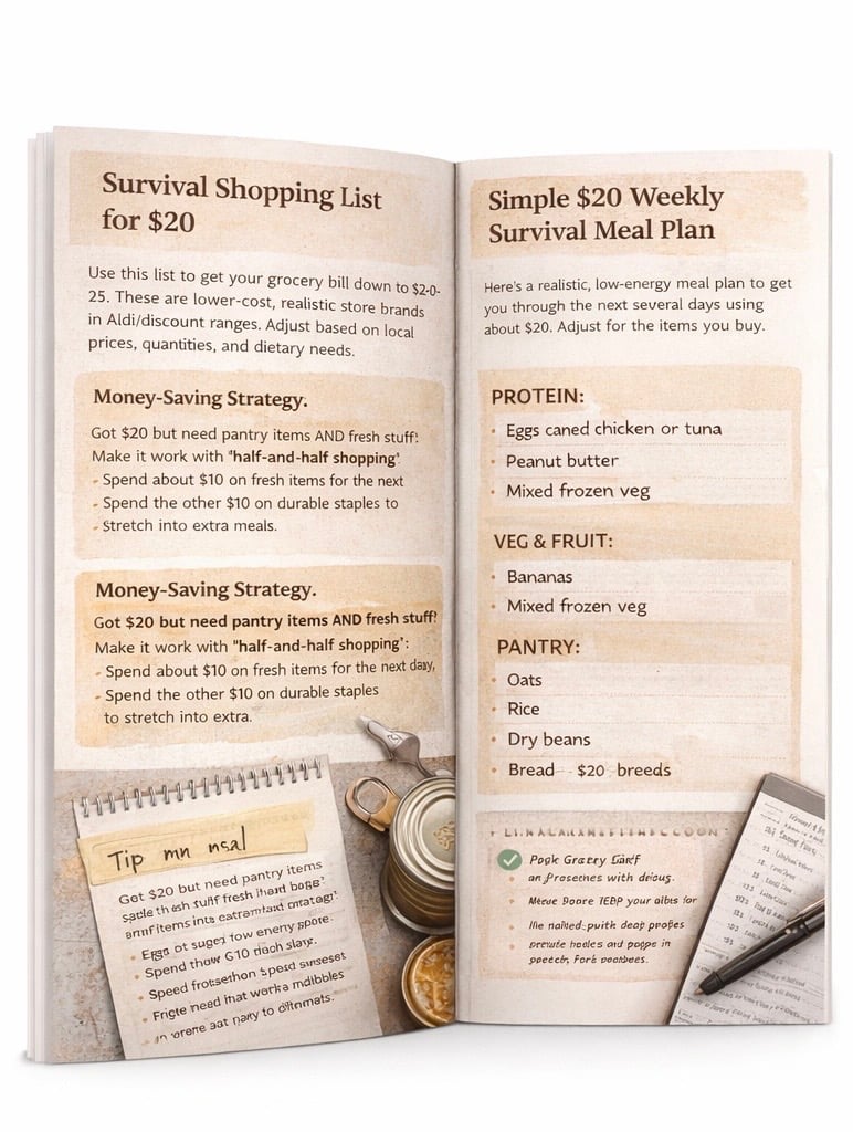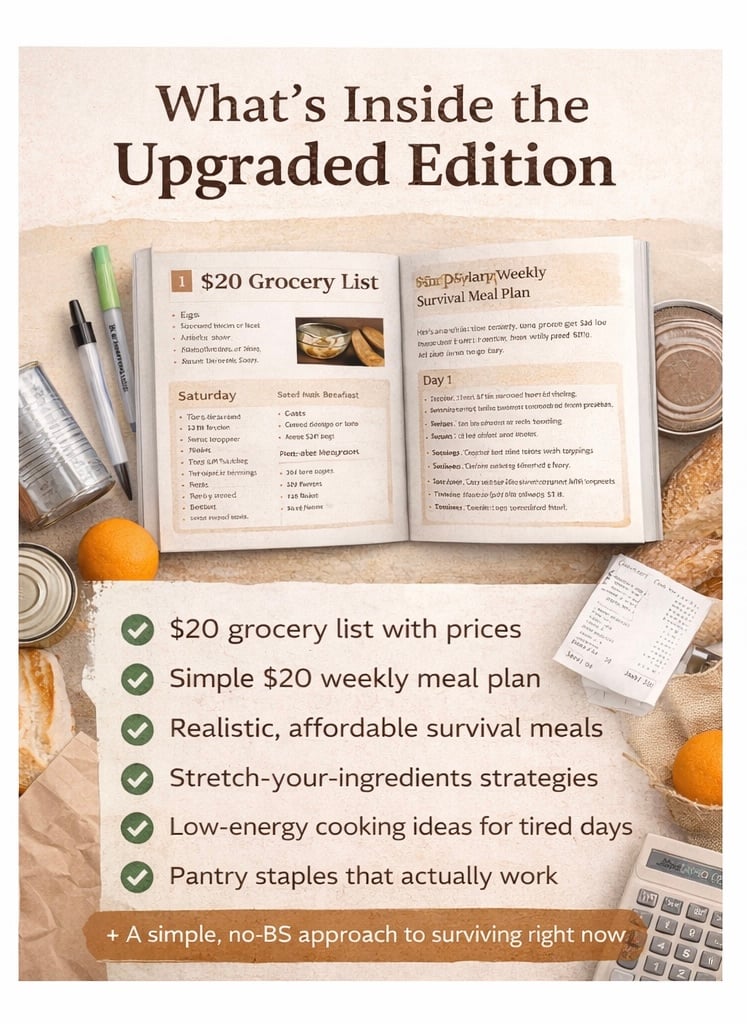 This upgraded survival guide shows you exactly how to feed yourself for about $20 using realistic, affordable grocery items and simple, low-energy meals.