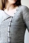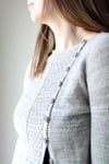 The asymmetrical front, a hint of waist shaping, and a row of delicate buttons make it a delightfully whimsical layer.