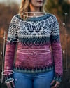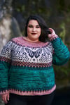 Like the butterfly itself, the Swallowtail design blends modern and natural elements for a balanced, yet striking, effect. The garment is constructed around a single zebra swallowtail placed prominently in front, with the remaining colorwork derived from various deconstructed features of the butterfly, including the striping and antennae, as well as modern shapes and patterns. For the body of the sweater, a pink-colored yarn is used as a nod to the flower of the pawpaw tree, which is the food plant of the zebra swallowtail.