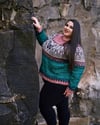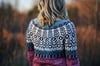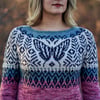 This fingering weight design features a total of four colors, but all colorwork rounds require only two olors to be carried at a time. For the sample, both a merino singles base and merino/linen base are used, but any combination of fingering weight yarns will work so long as gauge is met. The garment is seamless and worked top down and in the round. It also includes optional subtle waist shaping.