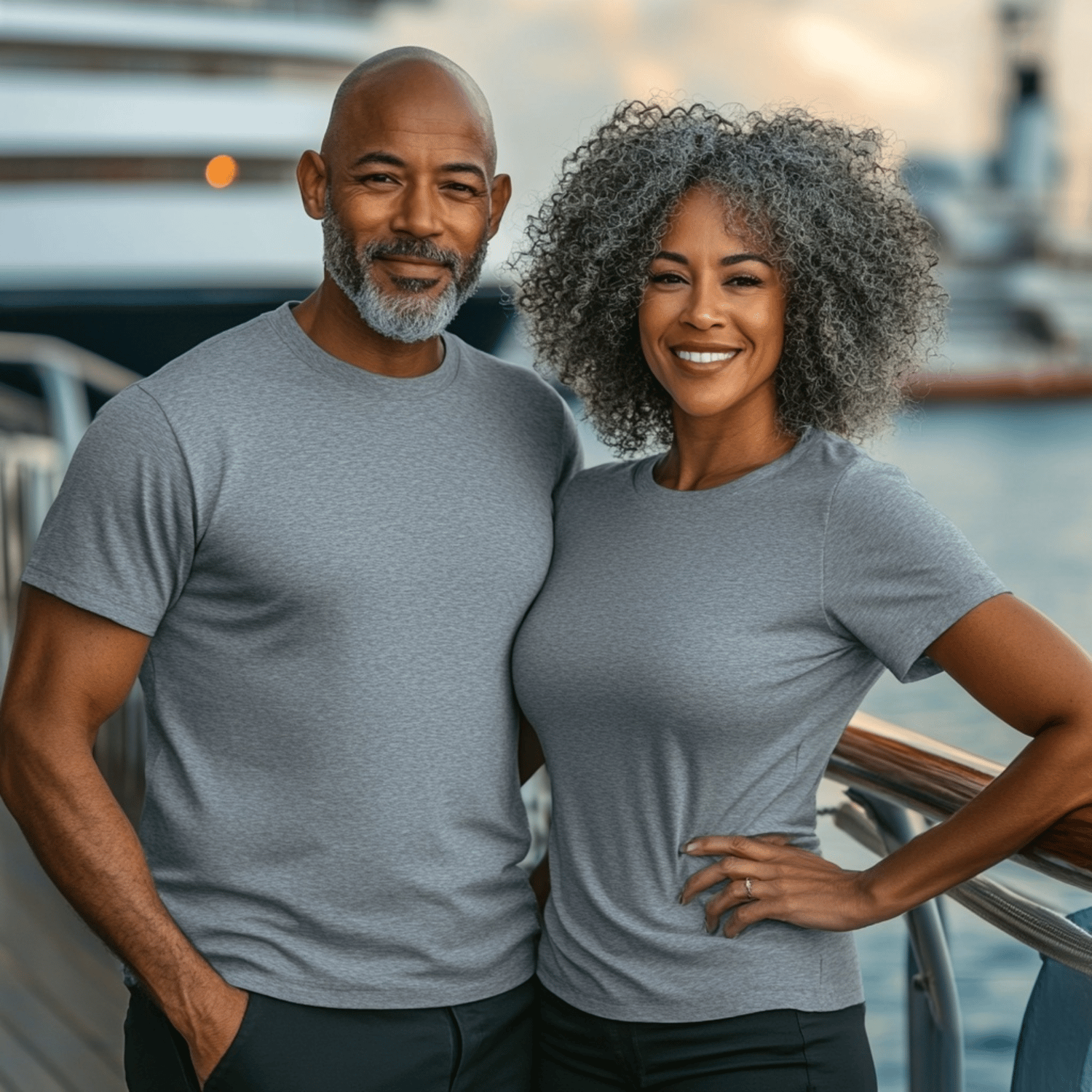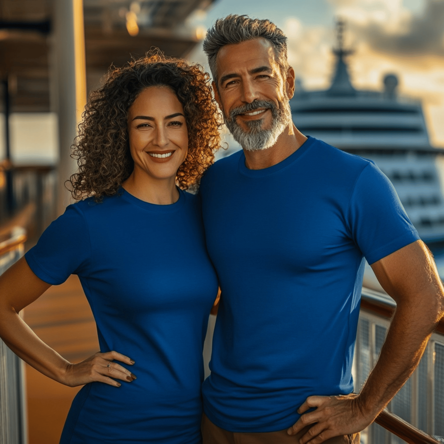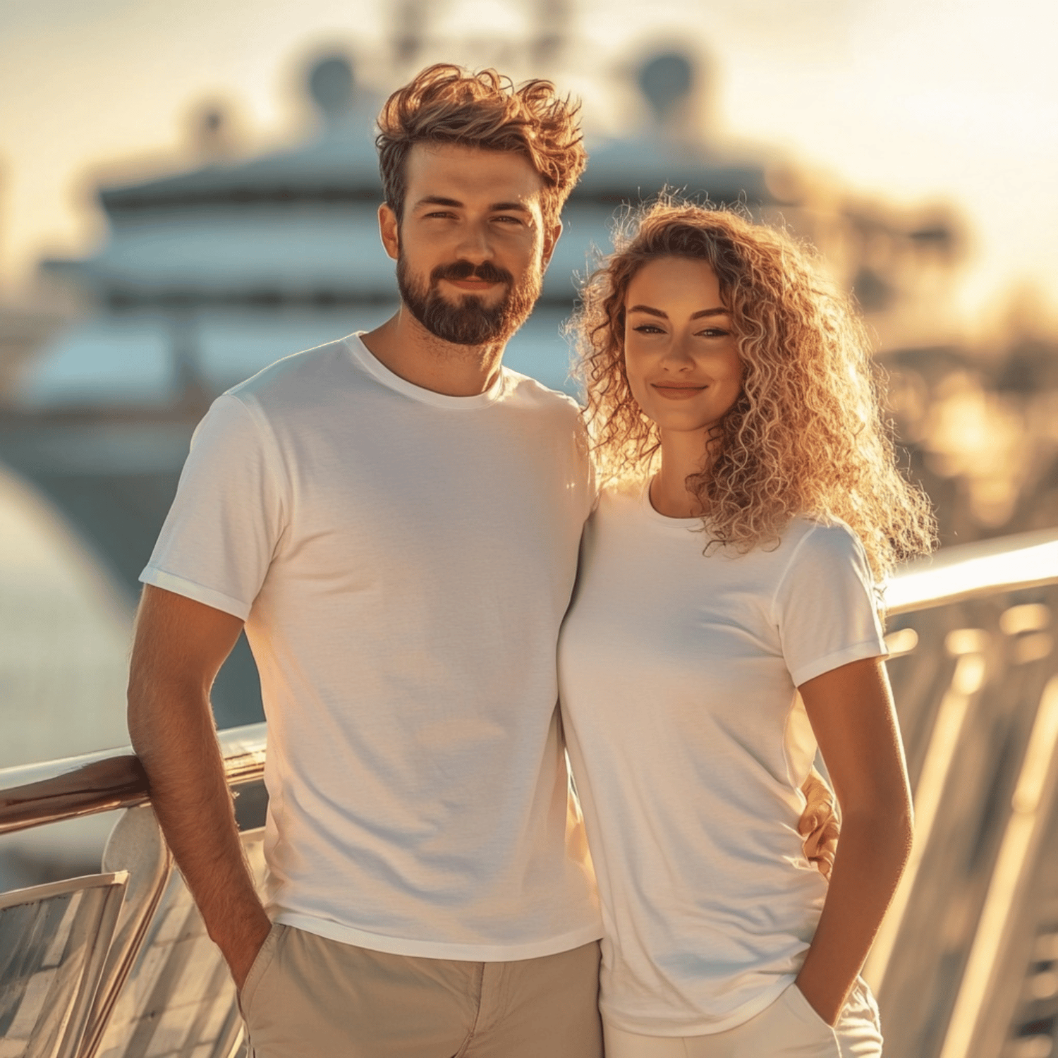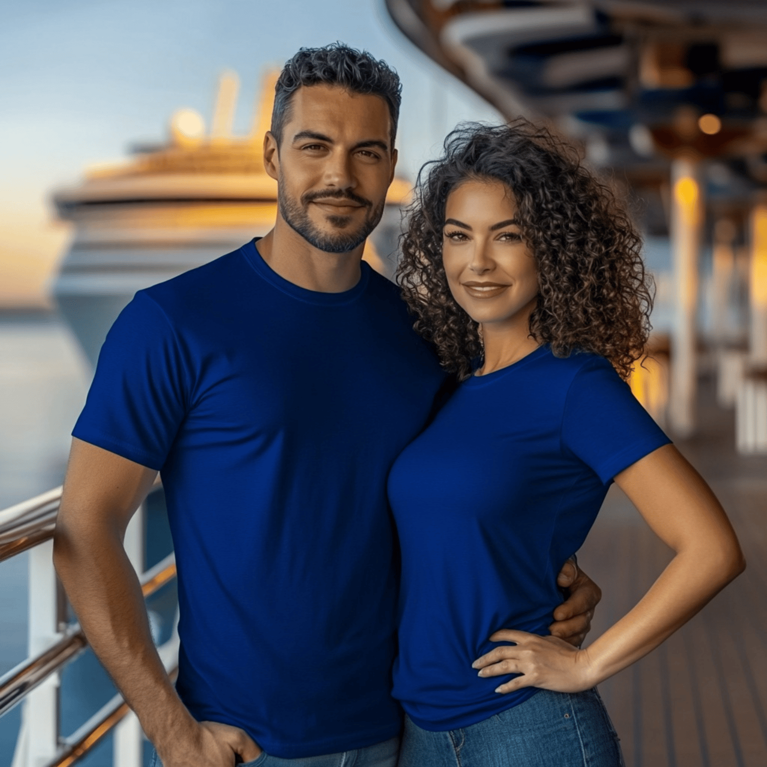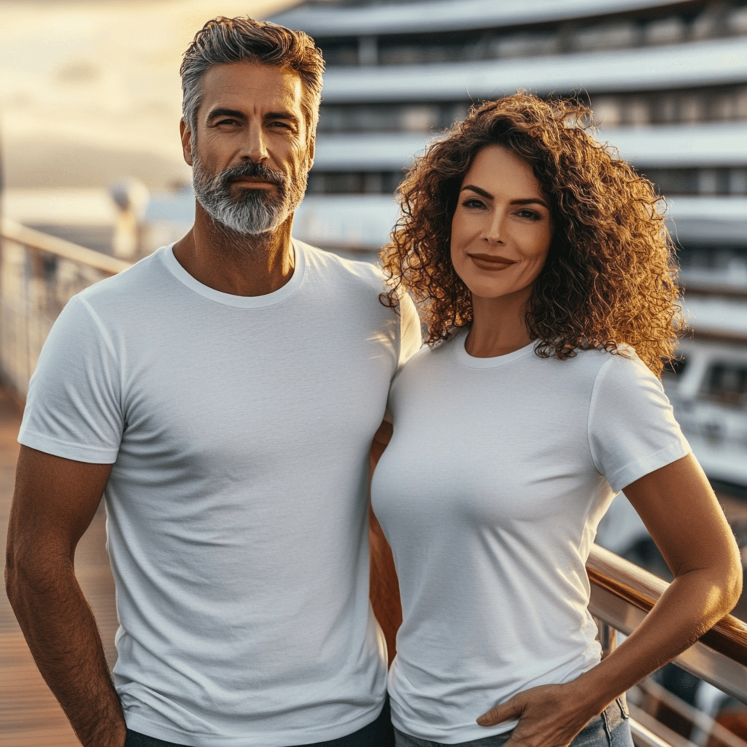 Perfect for showcasing your digital designs, sublimation artwork, or vacation tees in a realistic cruise setting. Each mockup features diverse couples in stylish blank tees, photographed on a cruise ship with natural lighting and warm vacation vibes.
