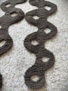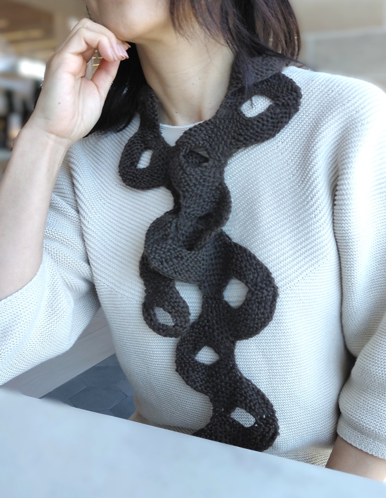 久しぶりに訪れた東京・銀座の街で目にしたユニークなビルの外装。それをヒントに生まれたのが「わ・わ・わ」スカーフです。3種類のサイズの「輪」を繋ぎなら、糸を一度も切ることなく棒針で編みます。完成サイズや長さは自由に調整でき、使用する毛糸の太さや色を変えることで、モダン、シック、あるいはコミカルなど、多彩な雰囲気を表現できるデザインです。―Hiroka Shinokawa