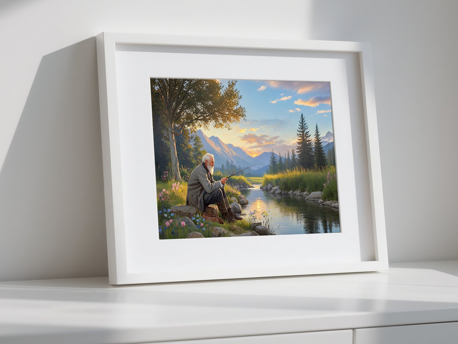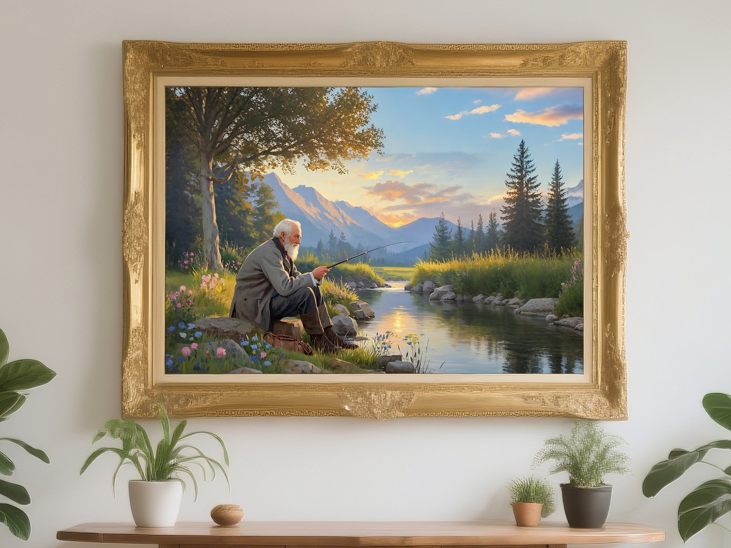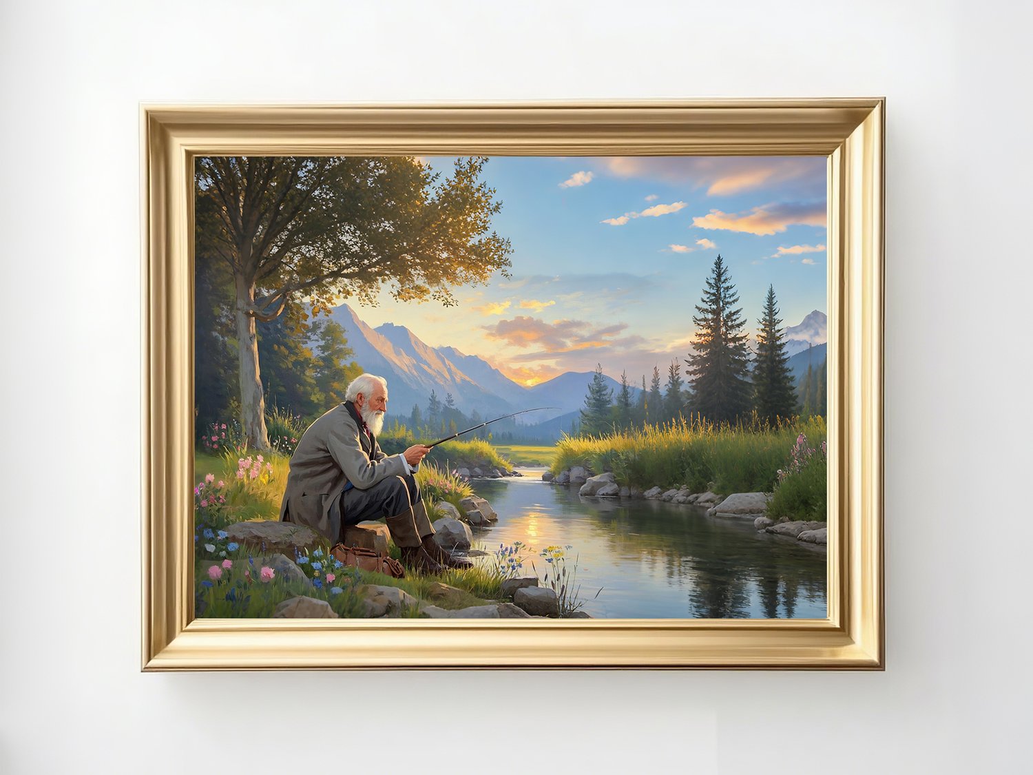 This artwork captures a serene riverside scene, featuring an elderly man peacefully fishing at sunset.