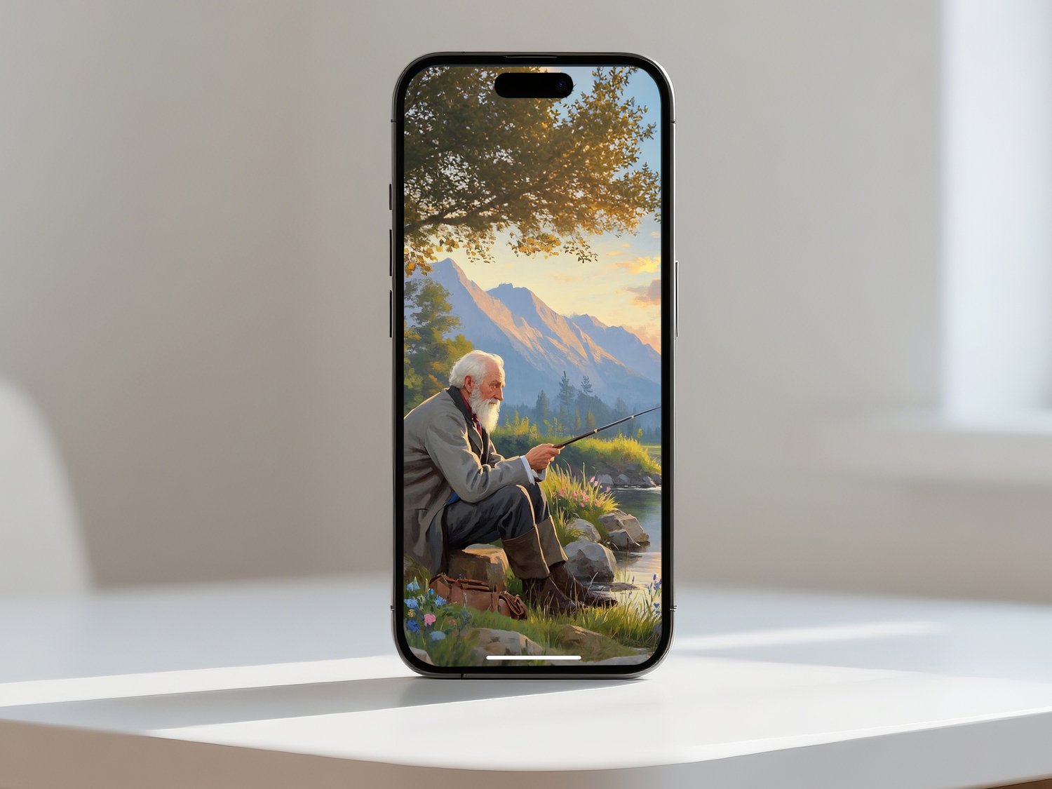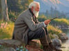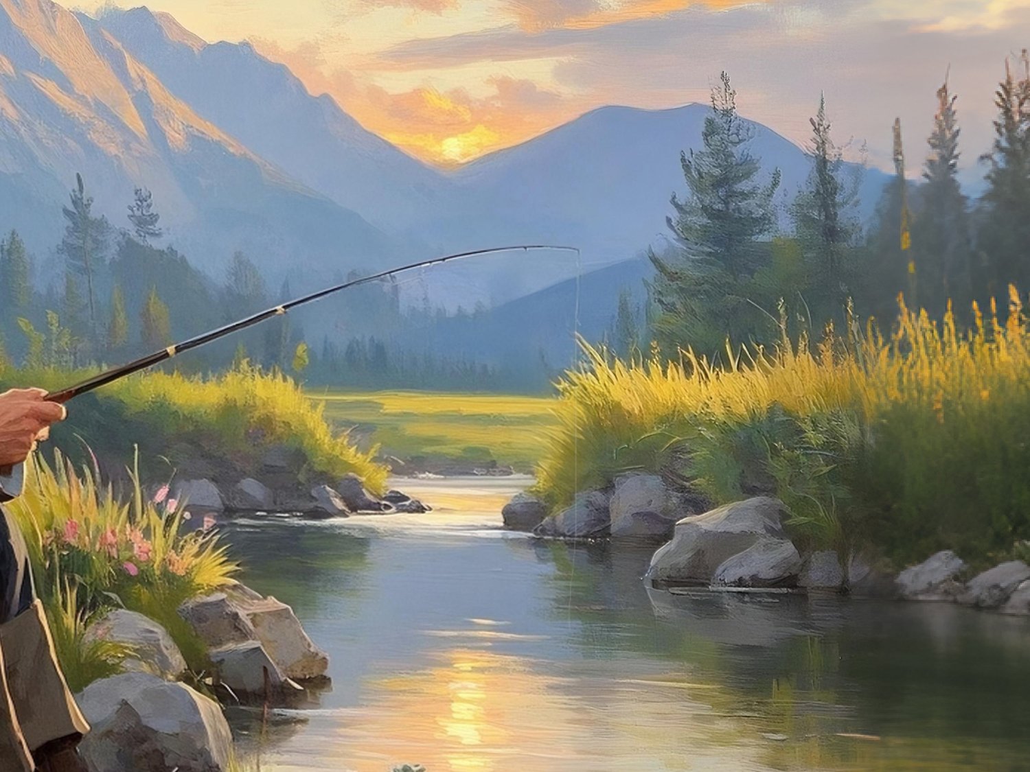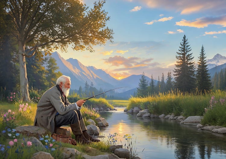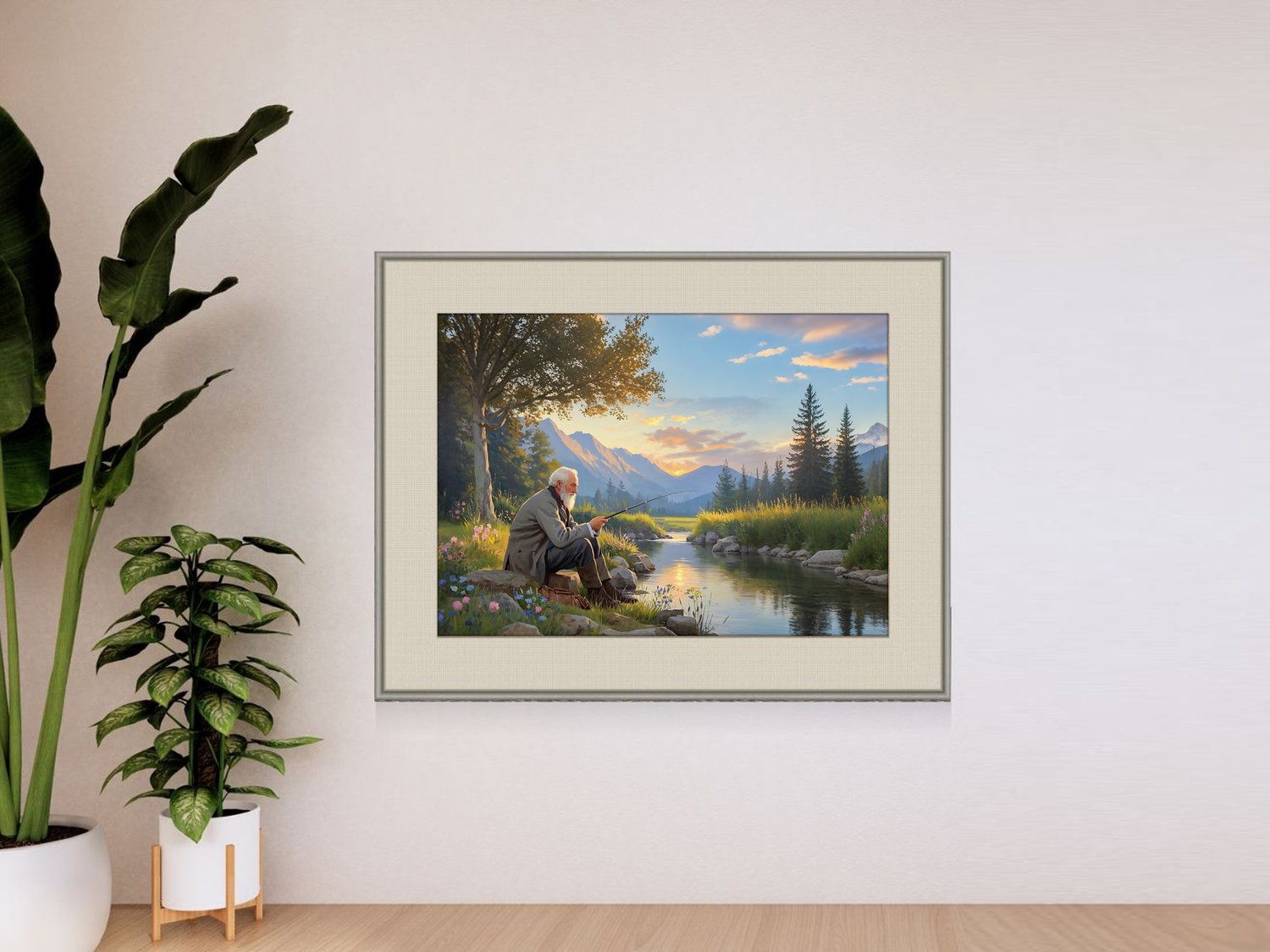 This artwork captures a serene riverside scene, featuring an elderly man peacefully fishing at sunset.