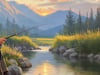 The glowing light of the setting sun, reflected in the river alongside majestic mountains and lush meadows, creates a harmonious and calming atmosphere.