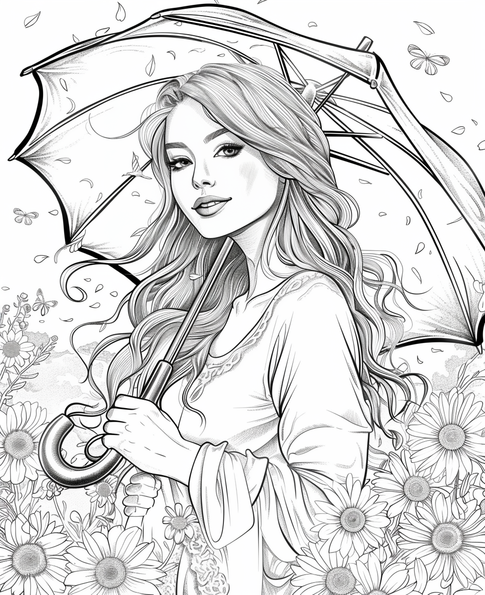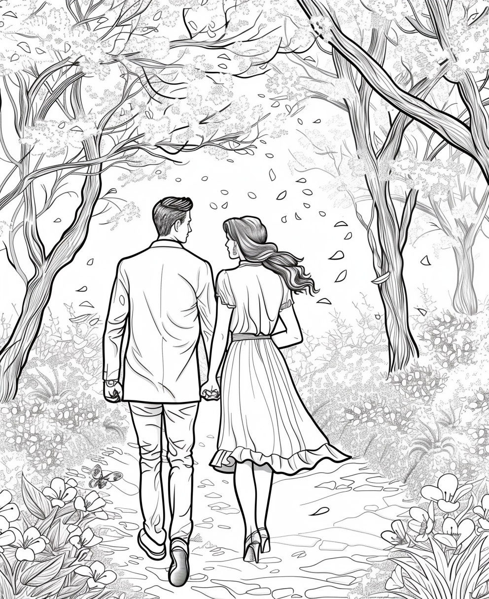 - 81 pages of beautifully illustrated spring scenes including couples walking in the park, bunnies, flower-filled umbrellas, and spring gardens.