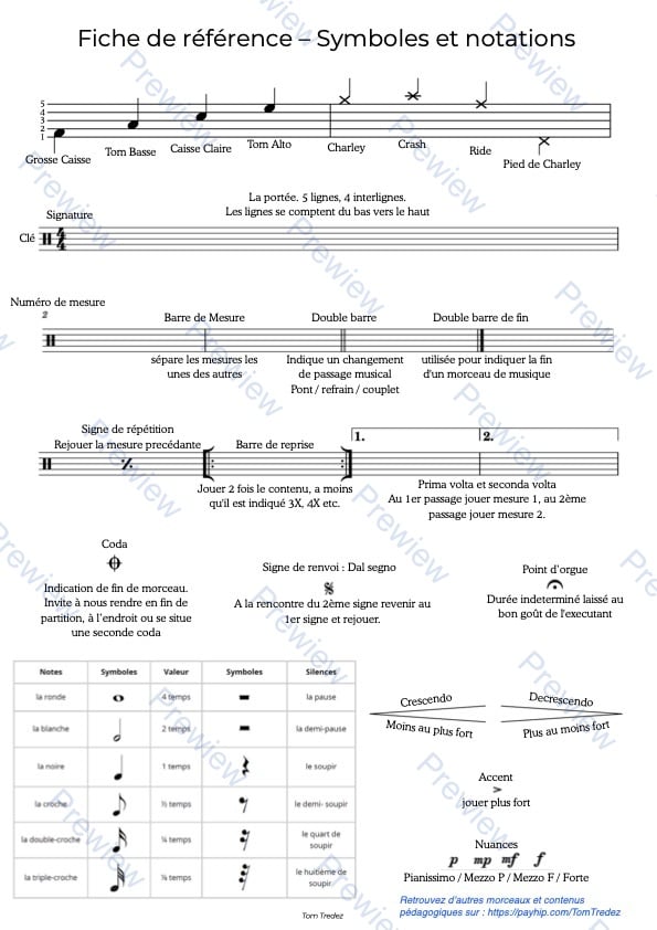 Cette fiche de référence regroupe l’ensemble des symboles et notations de solfège utilisés en batterie.