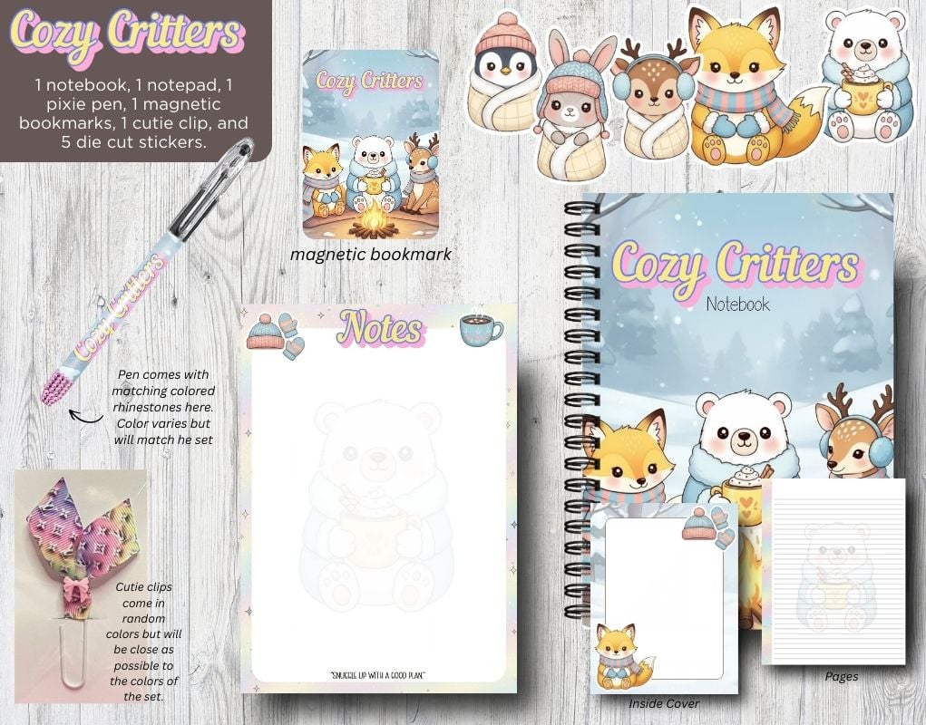 Every collection includes one handcrafted notebook for your big ideas and a matching notepad for those quick daily to-dos. You will also receive one pixie pen, one magnetic bookmark, and one decorative cutie clip to keep your papers organized. To top it off, I’ve included five premium die-cut stickers perfect for personalizing your favorite gear.