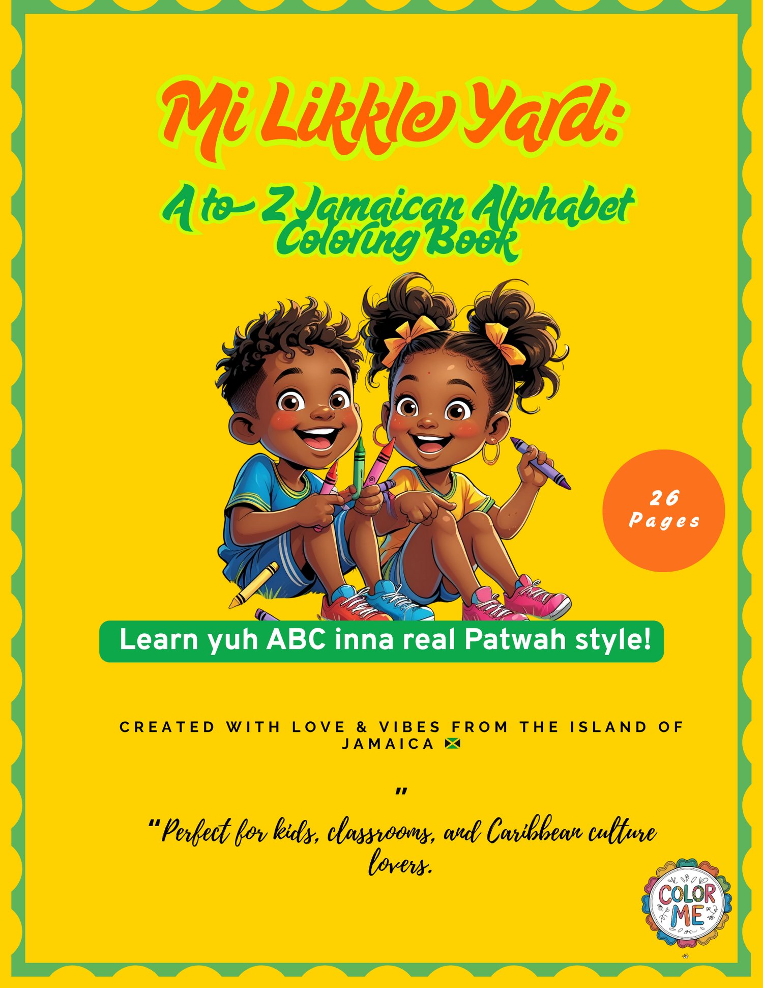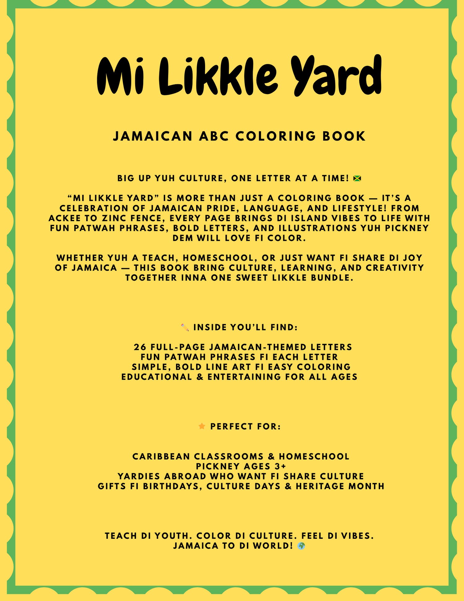 Mi Likkle Yard is a bold and fun-filled A–Z coloring book that teaches kids (and adults too!) their ABCs in true yardie style – using patwah, island phrases, and vibrant Jamaican culture.