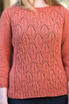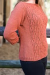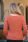 This beautiful pullover is a very satisfying knit. It's worked from the top down, in the round, so there's no seaming. The front and back are the same, with waist and hip shaping for a better fit. The sleeves are picked up and worked down from the armhole to a 3/4 length; if you'd like a longer sleeve, just work an even number of additional decrease rounds and change to ribbing when the sleeve is about an inch from your desired length. The cable and lace pattern is interesting and engaging, and is presented in both written and charted versions.